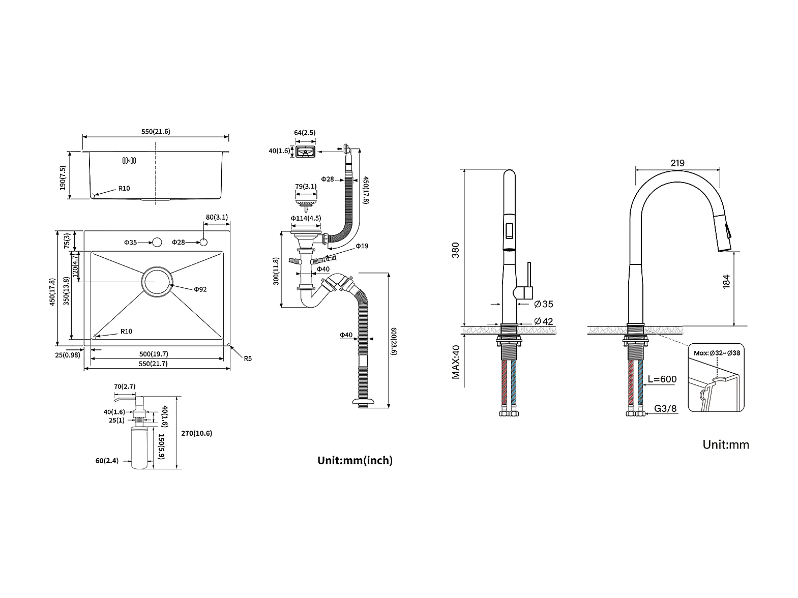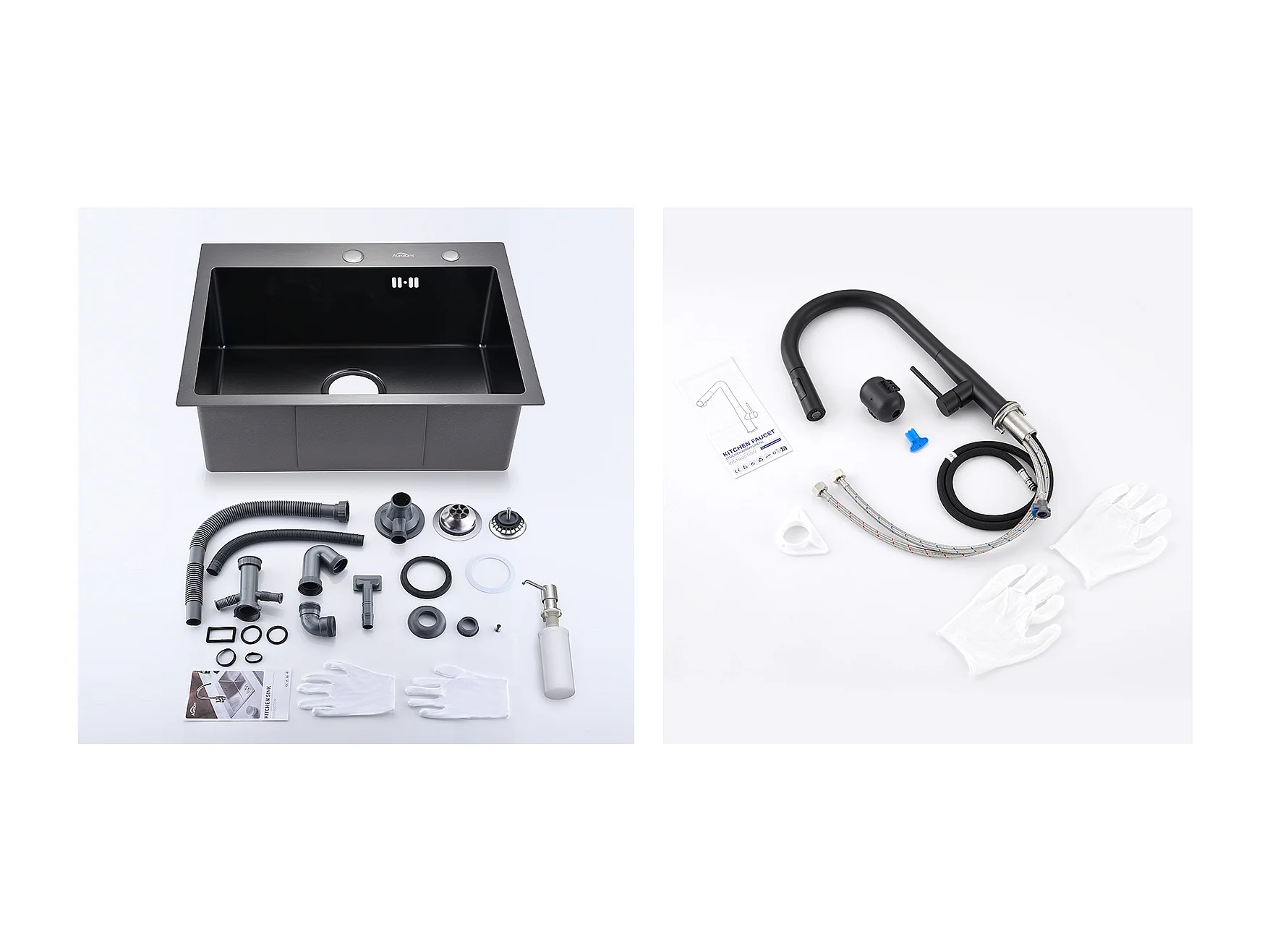 Aanrecht 1 Bak 55*45CM Zwart+Keukenkraan met DUitschuifbare, 360° draaibare, koud en warm water, U-vormige uittrek, zwart