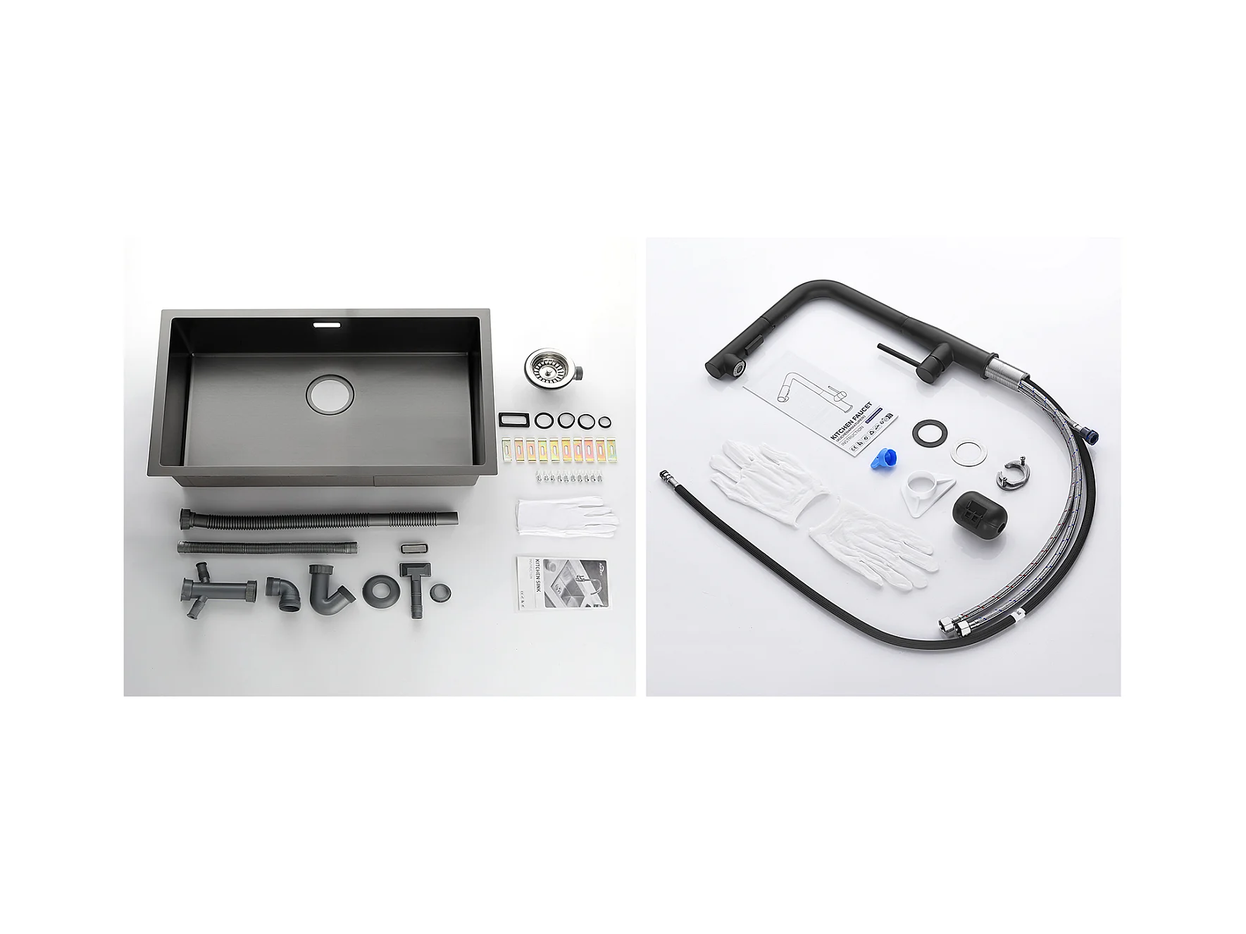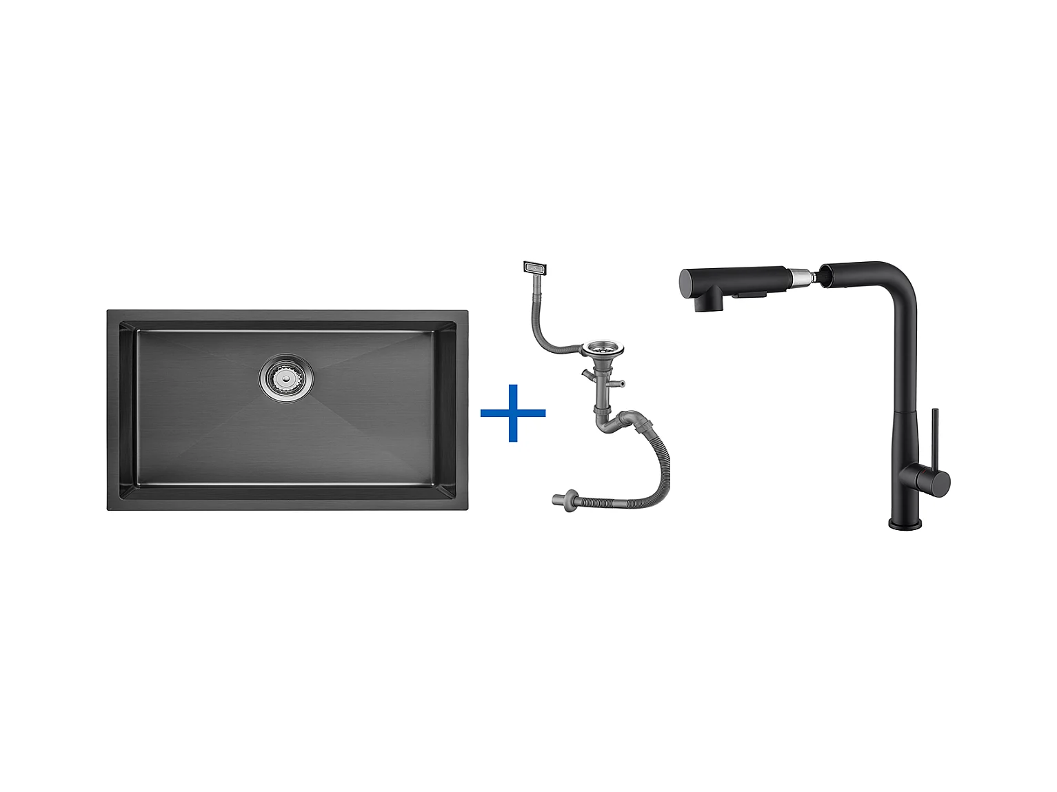 Aanrecht 1 Bak 70*44*19CM+Kokenkraan met Uittrekbare Handdouche 360 °2 Functies, Demonteerbare Romper, Zwart