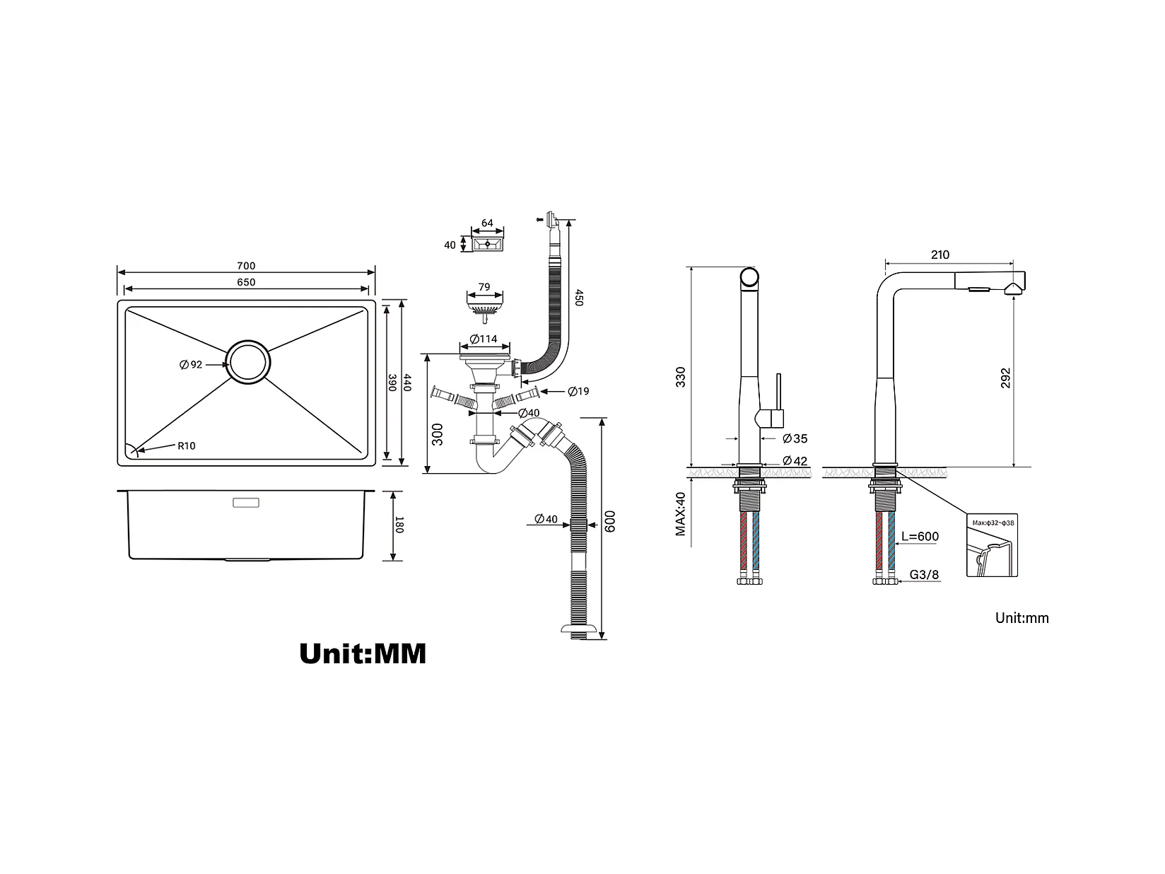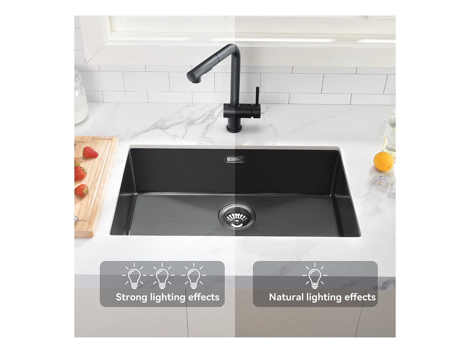 EviEr Keuken 1 Bak 70*44*19CM,Inbouw/Bloem/Ondergrond,Sifon/Te-Vol+Keukenkraan met Uittrekbare Handdouche,U-vormige Uitloop,Zwart