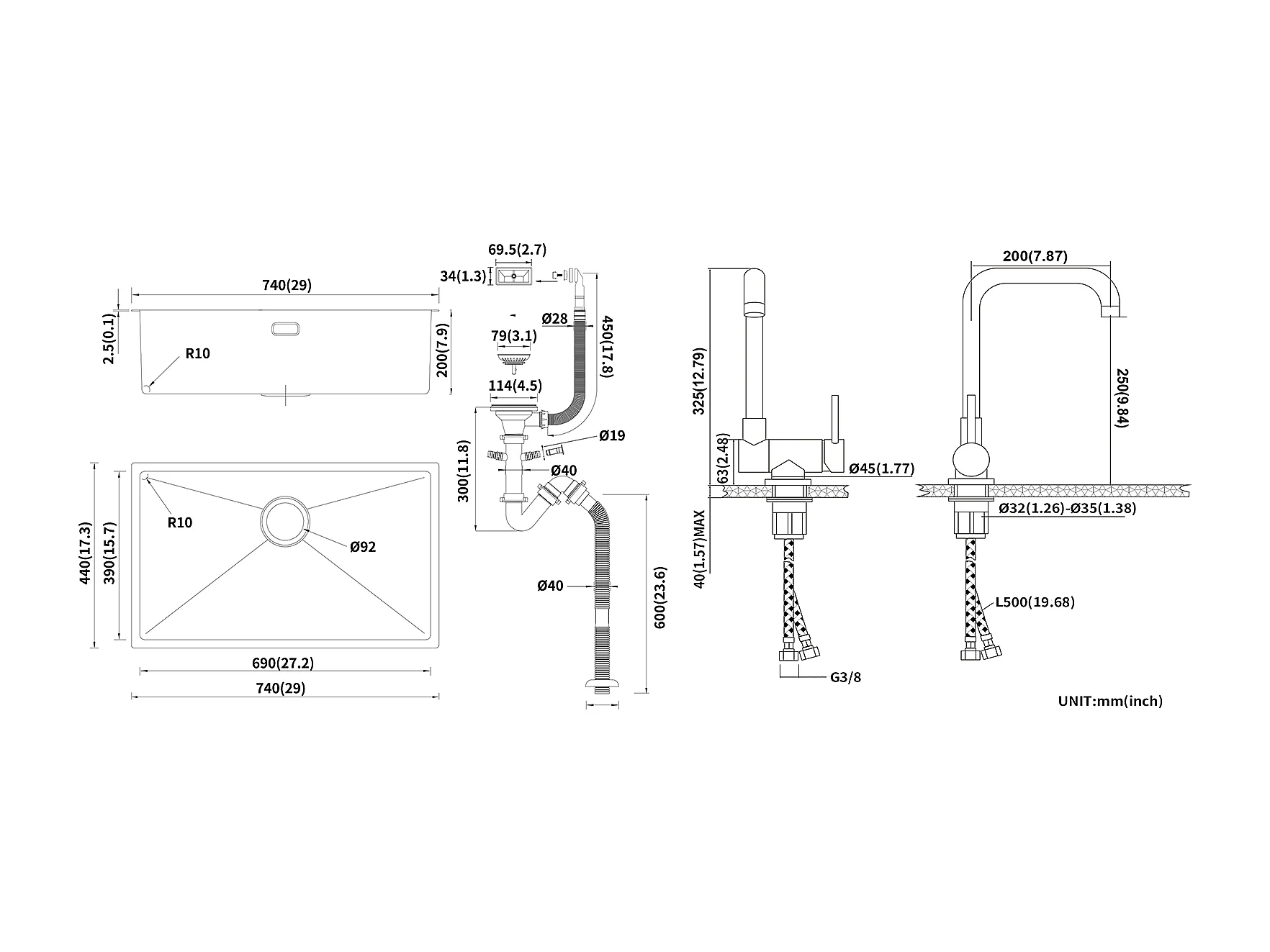 LONHEO MAX Aanrecht 1 Bak 74*44*20CM 304 RVS Geborstelde Gootsteen met Sifon en Overloop
