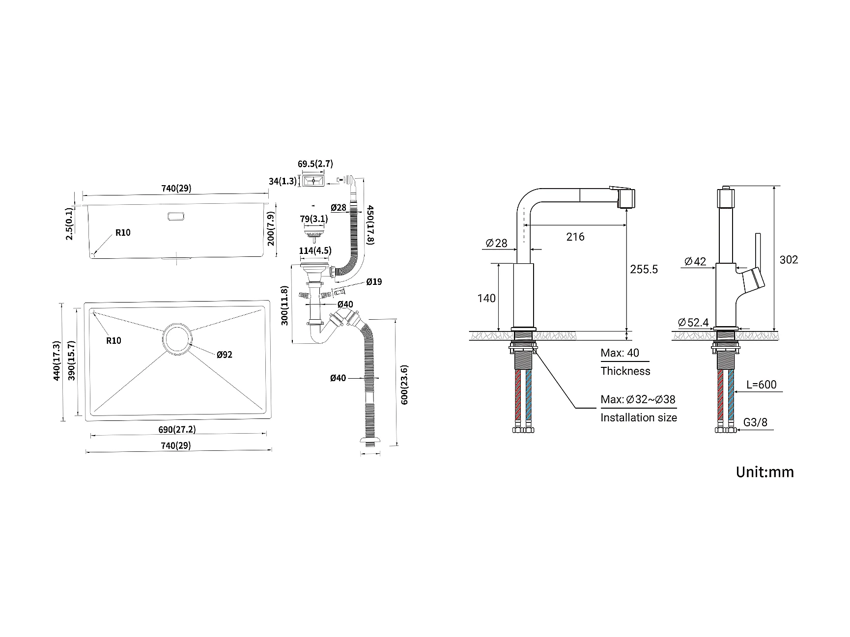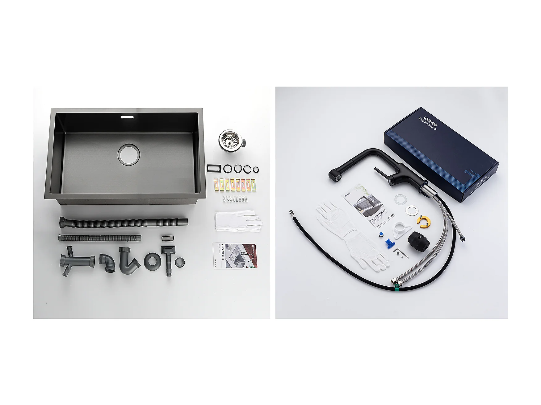 Aanrecht 1 bak 74*44*20CM, in geborsteld roestvrij staal met sifon en overloop + zwarte keukenkraan met uittrekbare handdouche