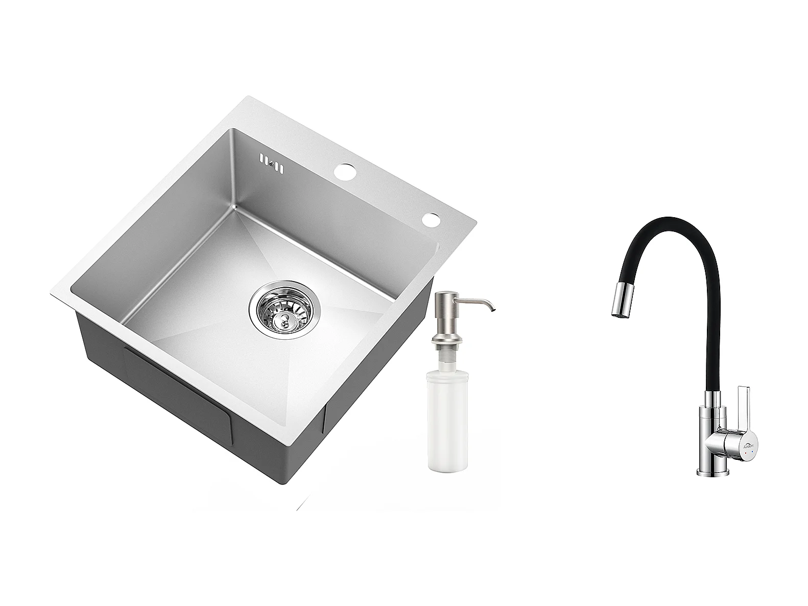 Aanrecht 1 bak zilver, 44*49*20 CM, met zeepdispenser, roestvrij staal + flexibele keukenkraan met hoge uitlop