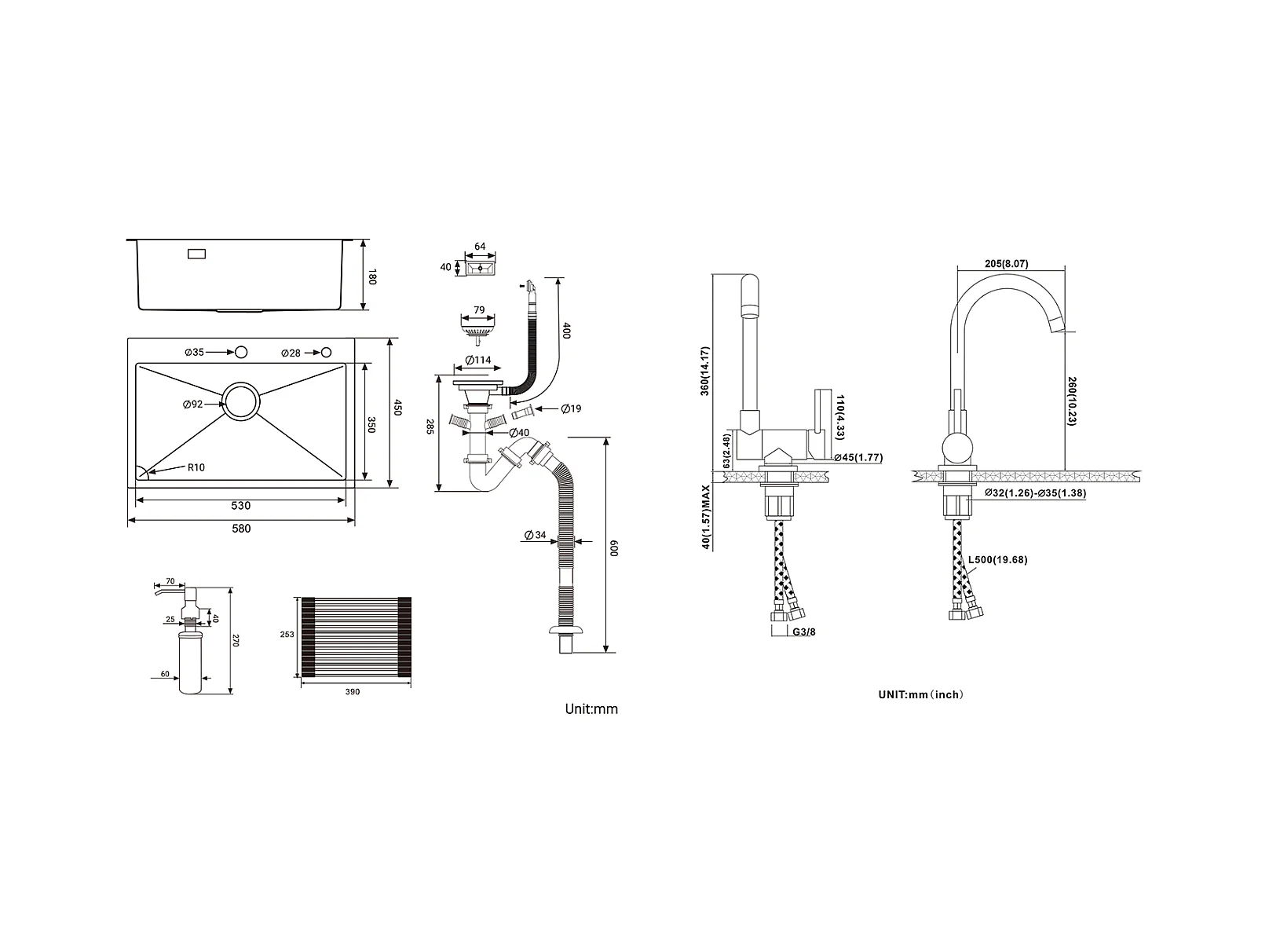 Aanrecht 1Bak 58*45*18CM, met Oprolbare gootsteenafdruiprek/Zeepdispenser+Keukenkraan met 360° Draaibare Uittrekbare Douche,Zwart