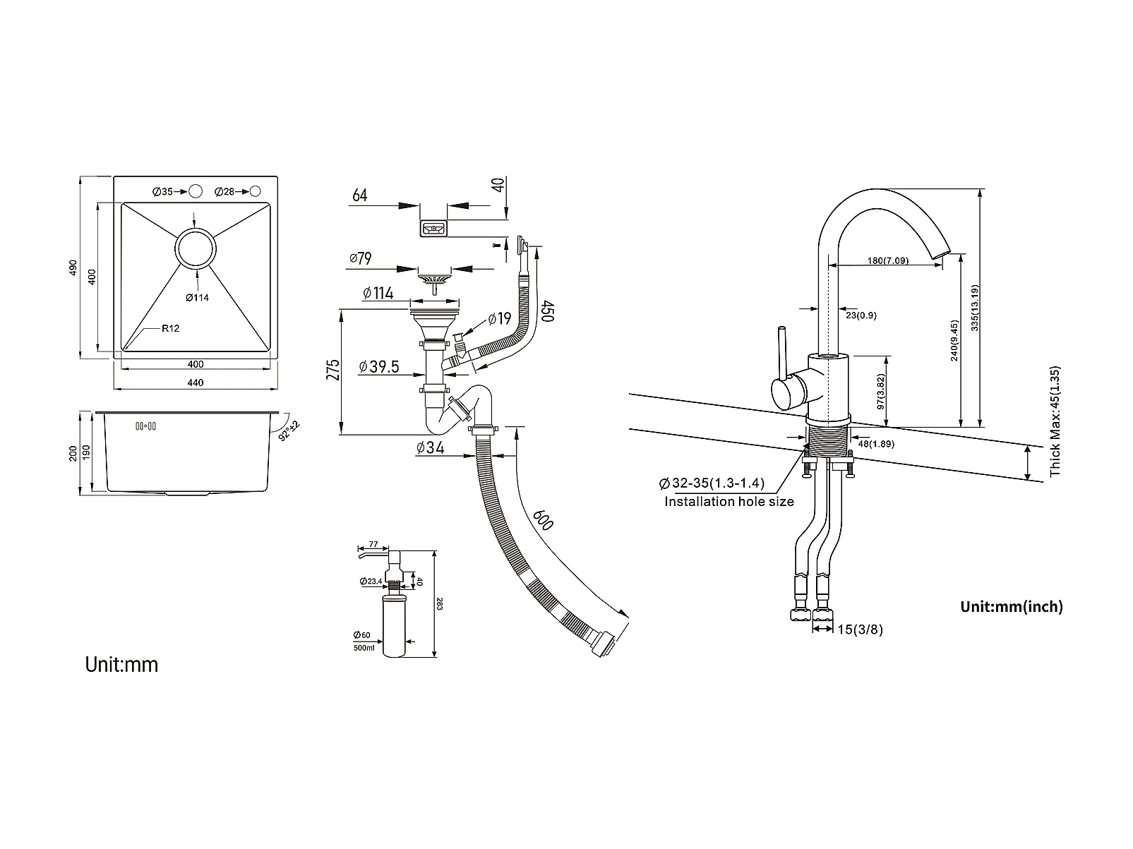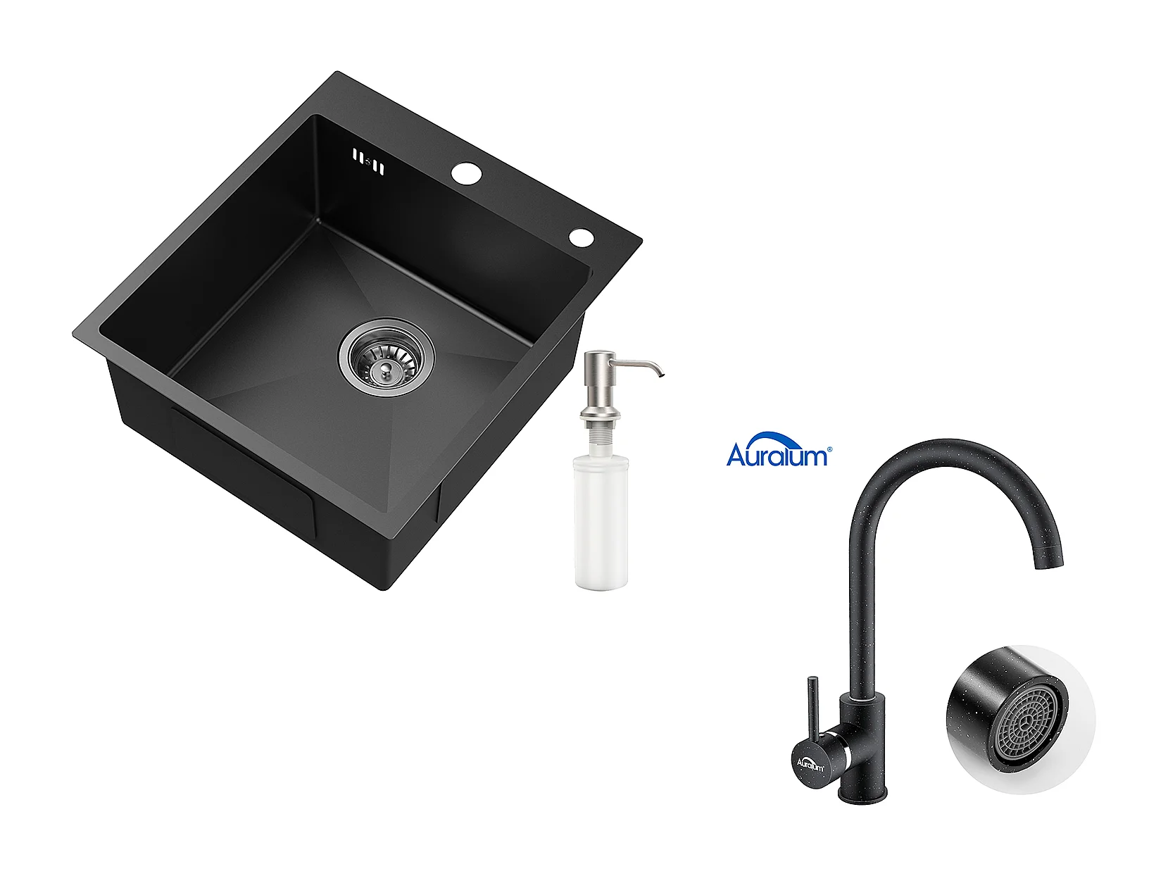 Aanrecht 1 Bak Zwart, RVS, 44*49*20 CM, met Zeepdispenser+ 360° Draaibare KeukenkraanKoud Water Warm Zwart met witte stippen