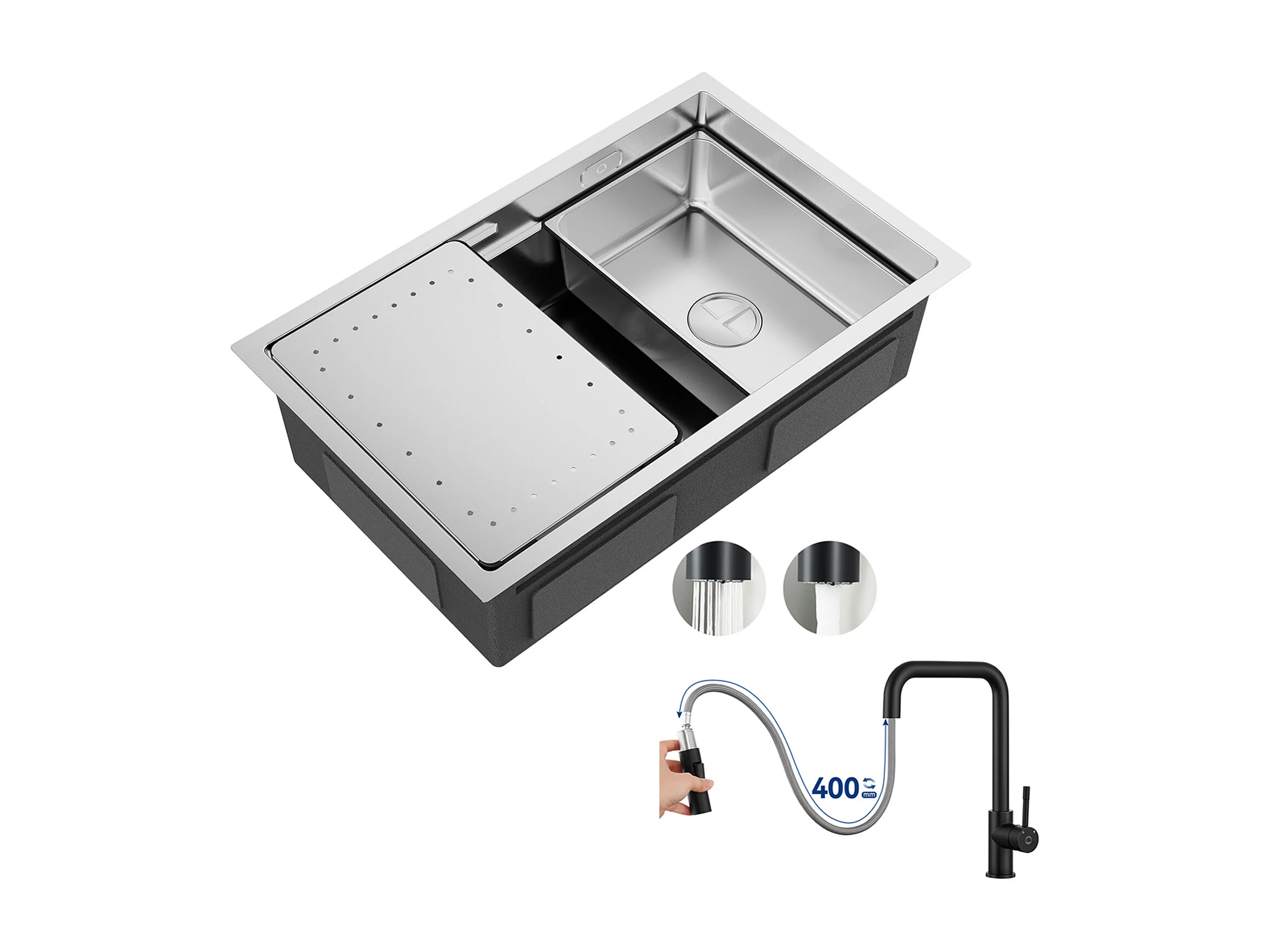 Cecipa max 1 wastafel 70×44cm Geborsteld roestvrij staal Ingebouwde spoelbak met afdruiprek en wastafel + mengkraan met uittrekbare spray, 3 waterafvoermodi