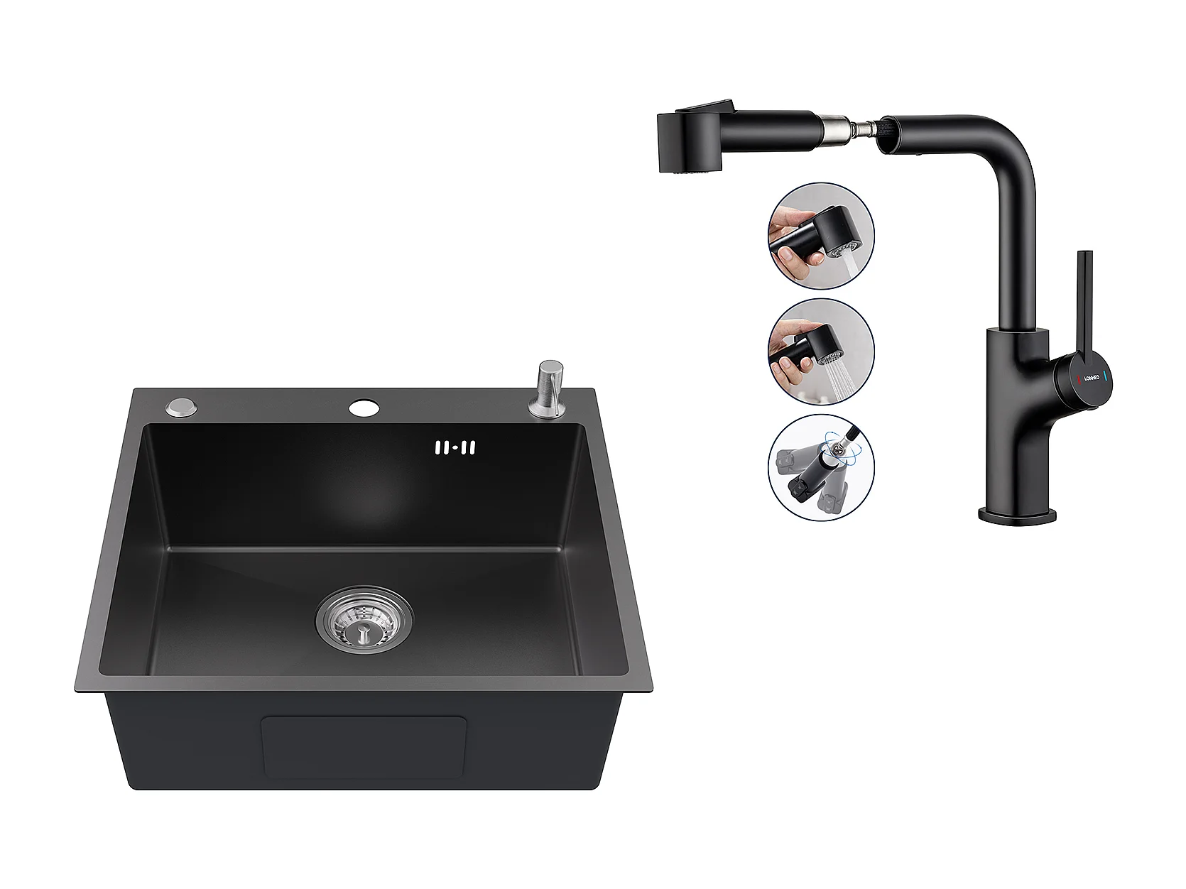 Aanrecht 1Bak 54*49*20 CM,Rox,Zwart Grijs,Spoelbak met Zeepdispenser+Zwart Keukenkraan met Uittrekbare Handdouche,Twee Jets