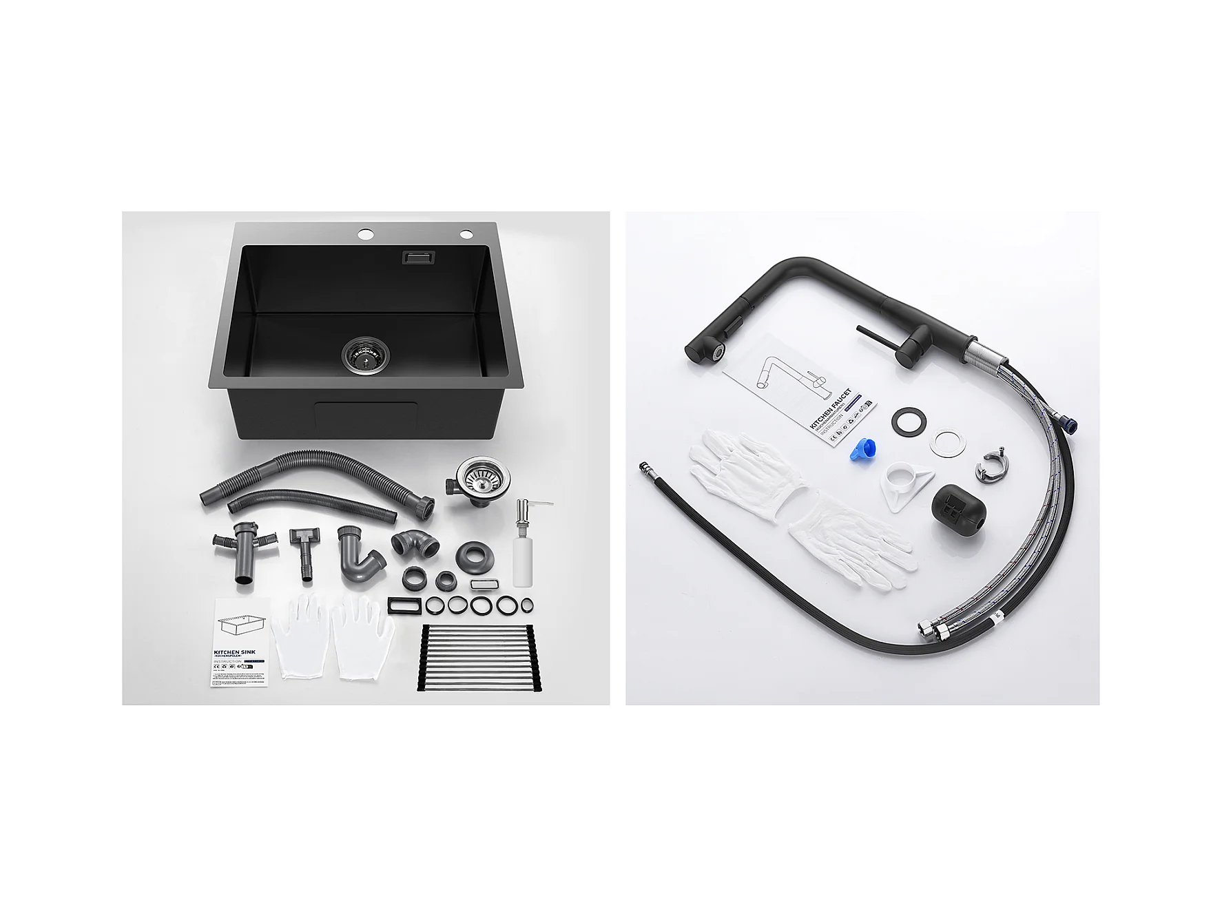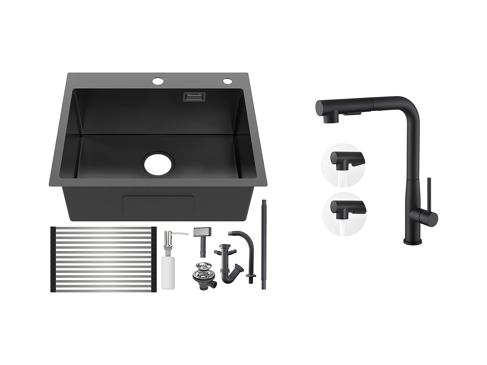 Aanrecht 1Bak Zwart 58*45*18CM,met EgOprolbare gootsteen/Zeepdispenser+Kran Keukenkraan Uittrekbare Handdouche Twee Stralen ,Zwart