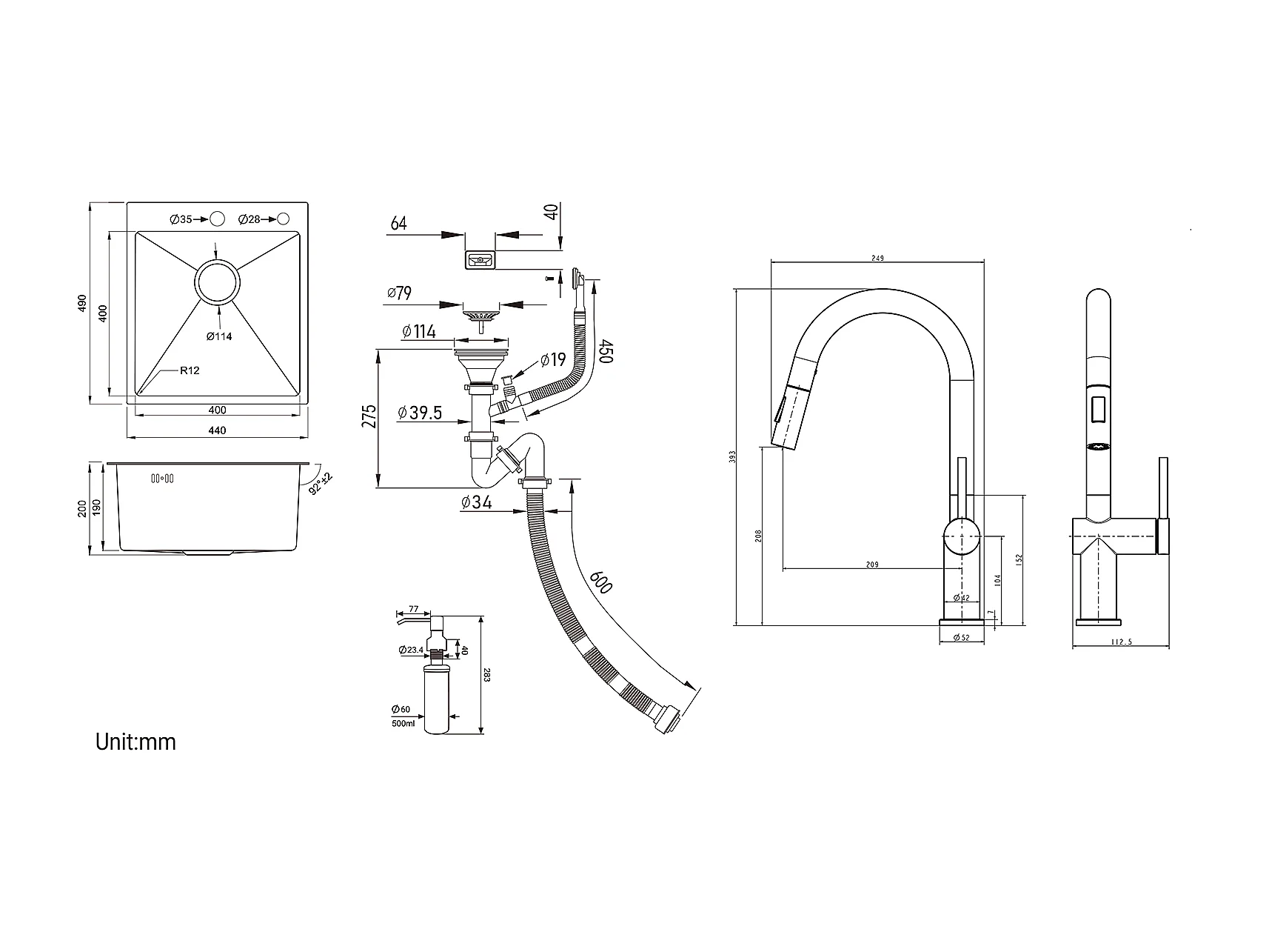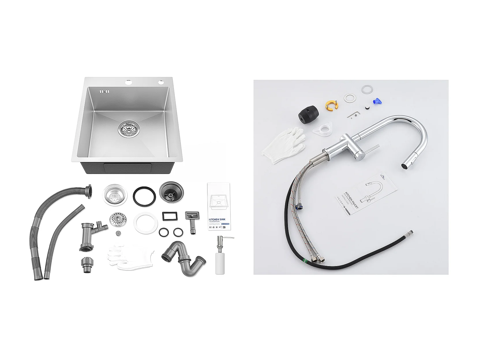 Aanrecht 1Bak Zilver,44*49*20 CM, met zeepdispenser, roestvrij staal + intrekbare keukenkraan met twee functies, chroom