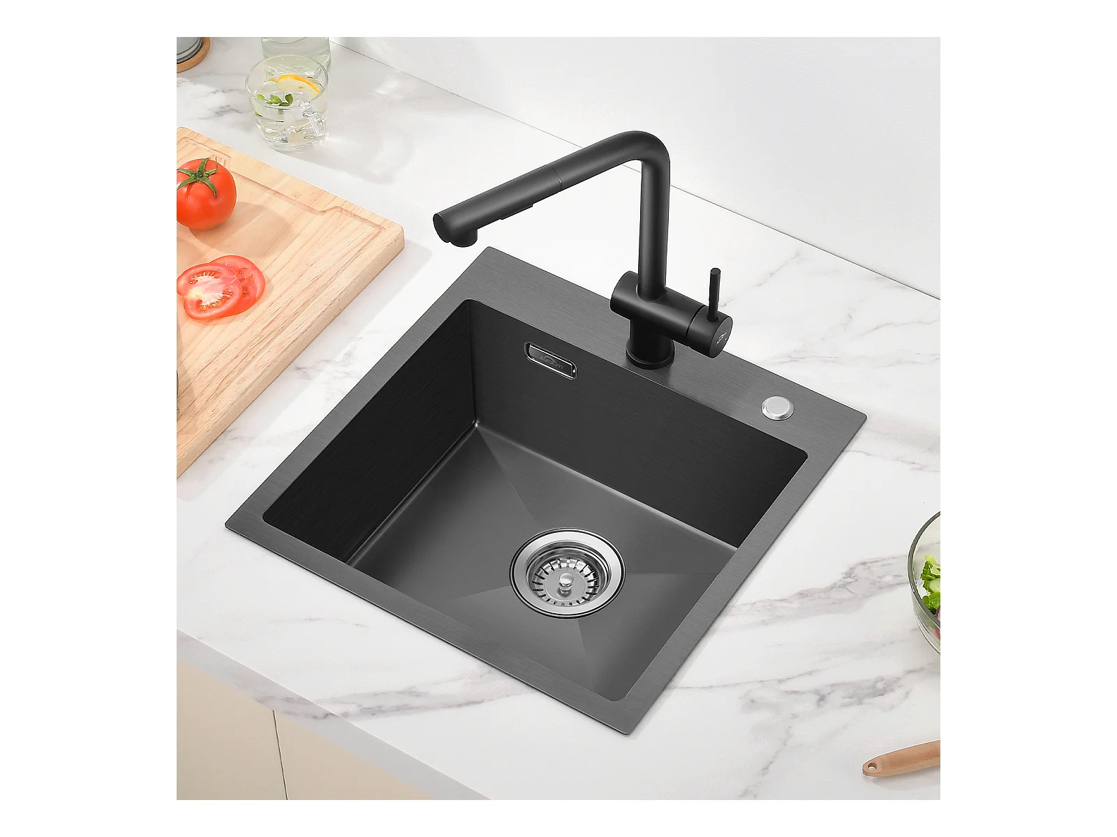 Zwarte Aanrecht 1 Bak 45x45CM Roestvrij Staal 304 , Inbouw en Opzetbaar + Draaibare Keukenkraan 360° Uittrekbare Handdouche