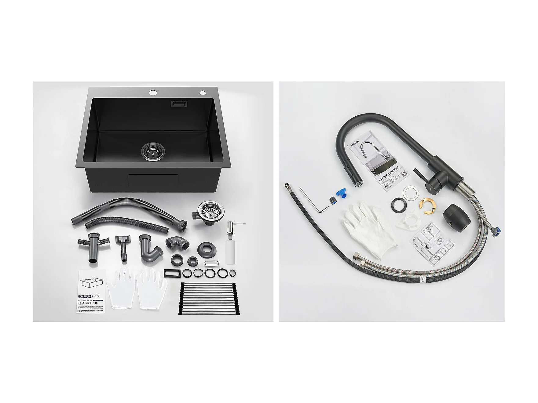 Aanrecht Keuken1Bak 58*45*18CM,met oprolbare gootsteenafdruiprek/zeepdispenser+360 ° roterende uittrekbare keukenkraan,2 functies,zwart