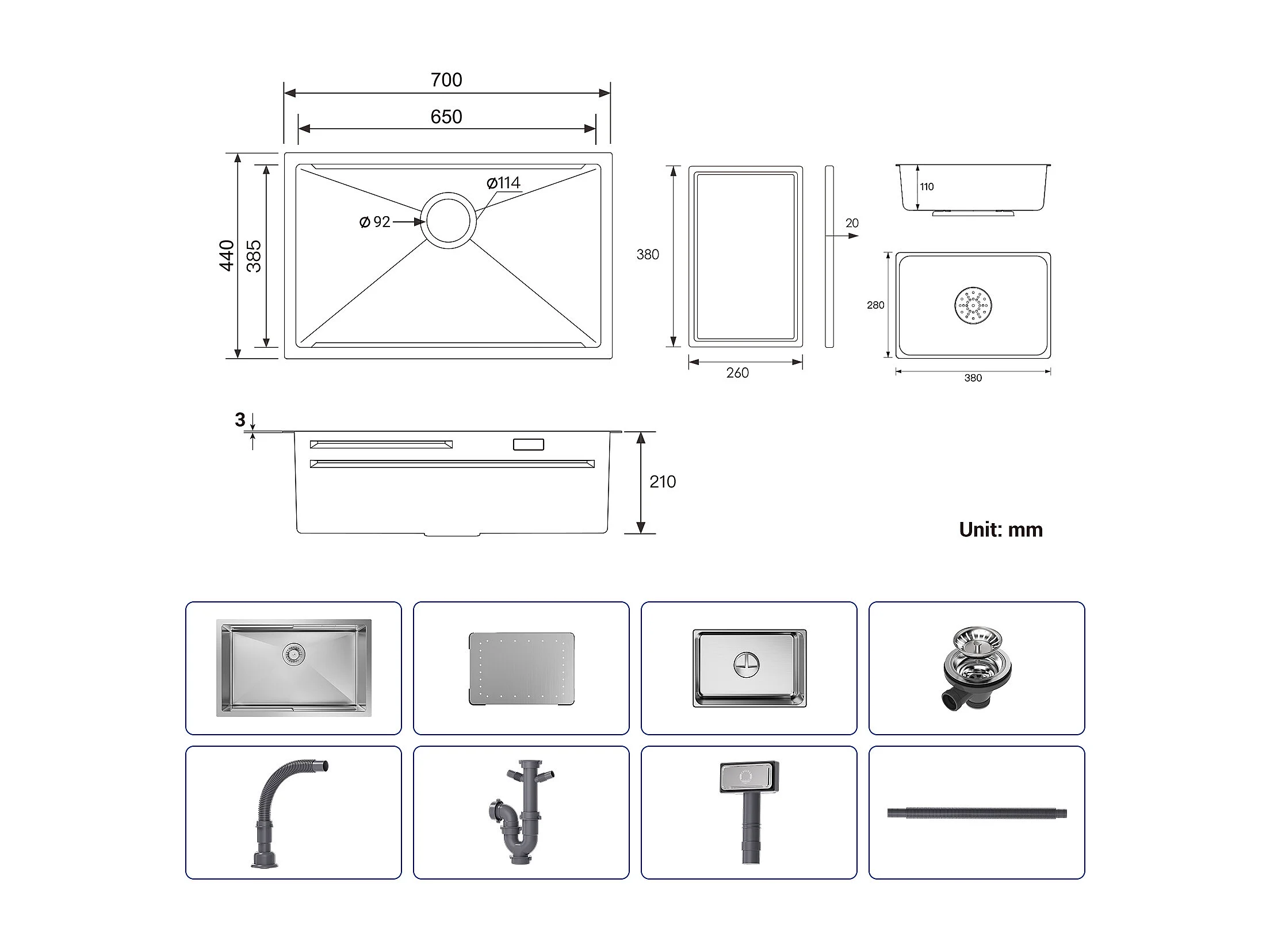 Cecipa max 1 wastafel keukenspoelbak 70×44×21CM geborsteld roestvrij staal ingebouwde spoelbak met afdruiprek en wastafel, EU-model