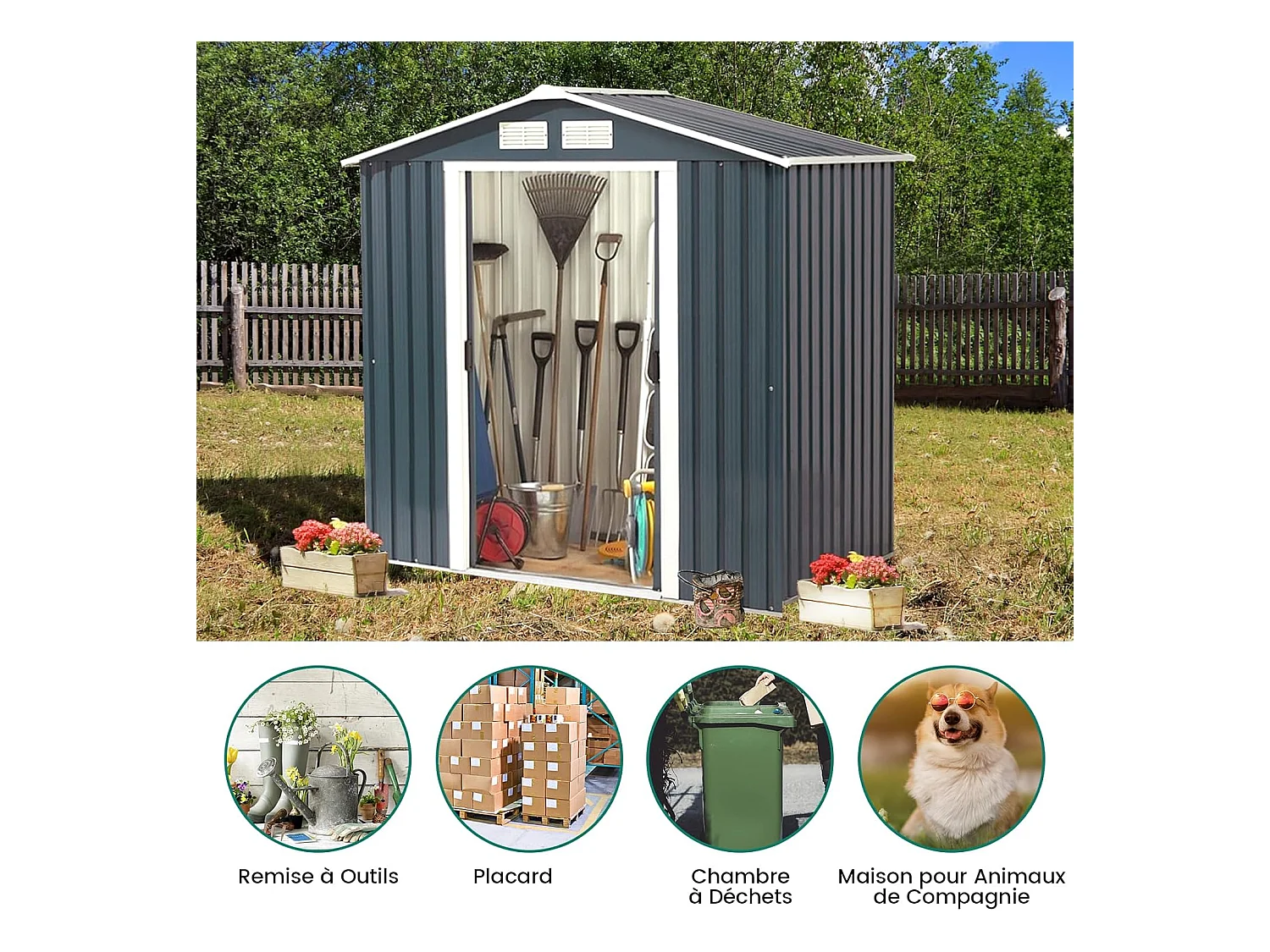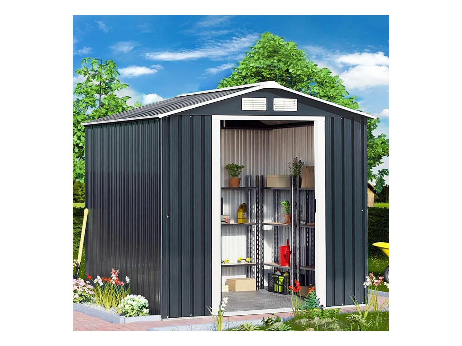 4,7㎡ Gegalvaniseerd stalen metalen tuinhuisje voor buiten met fundering, hellend dak, 4 luiken, dubbele schuifdeur, tuinhuisje voor buiten met oprit, voor fiets, prullenbak, 260x207x181cm
