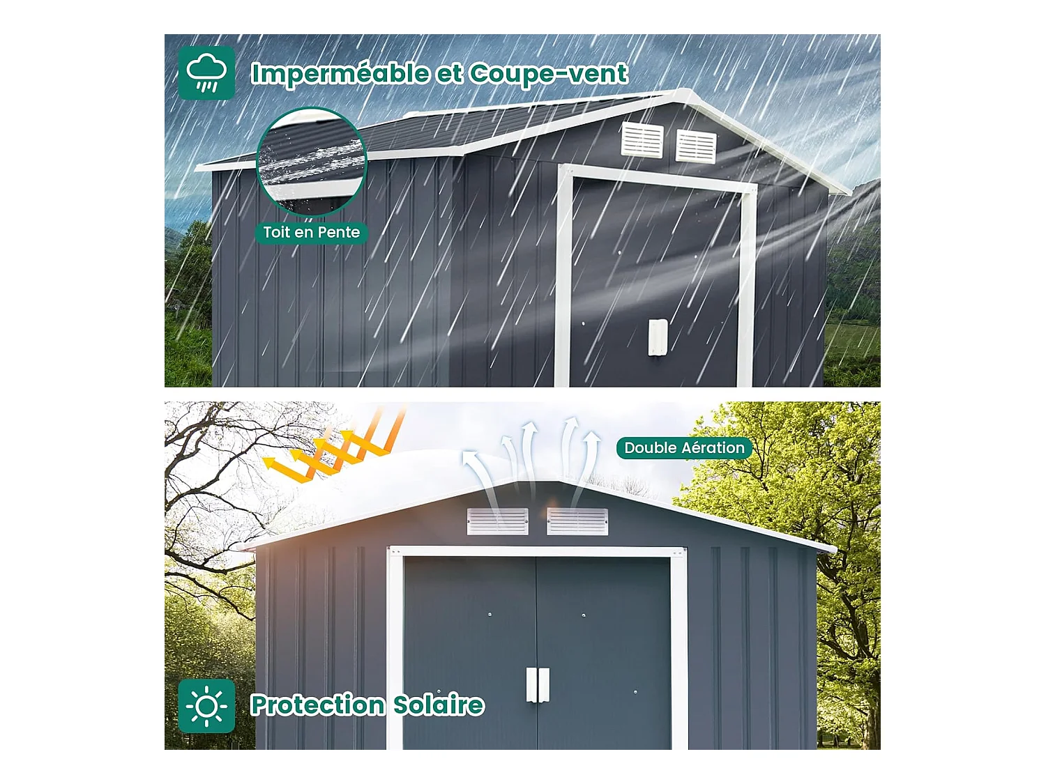Abri de Jardin en Métal-4,07㎡-2 Portes Coulissantes Verrouillables-4 Trous d’Aération/1 Abri de Jardin+1 Kit d'Extension-213,5 x 191 x 194,5cm-Gris