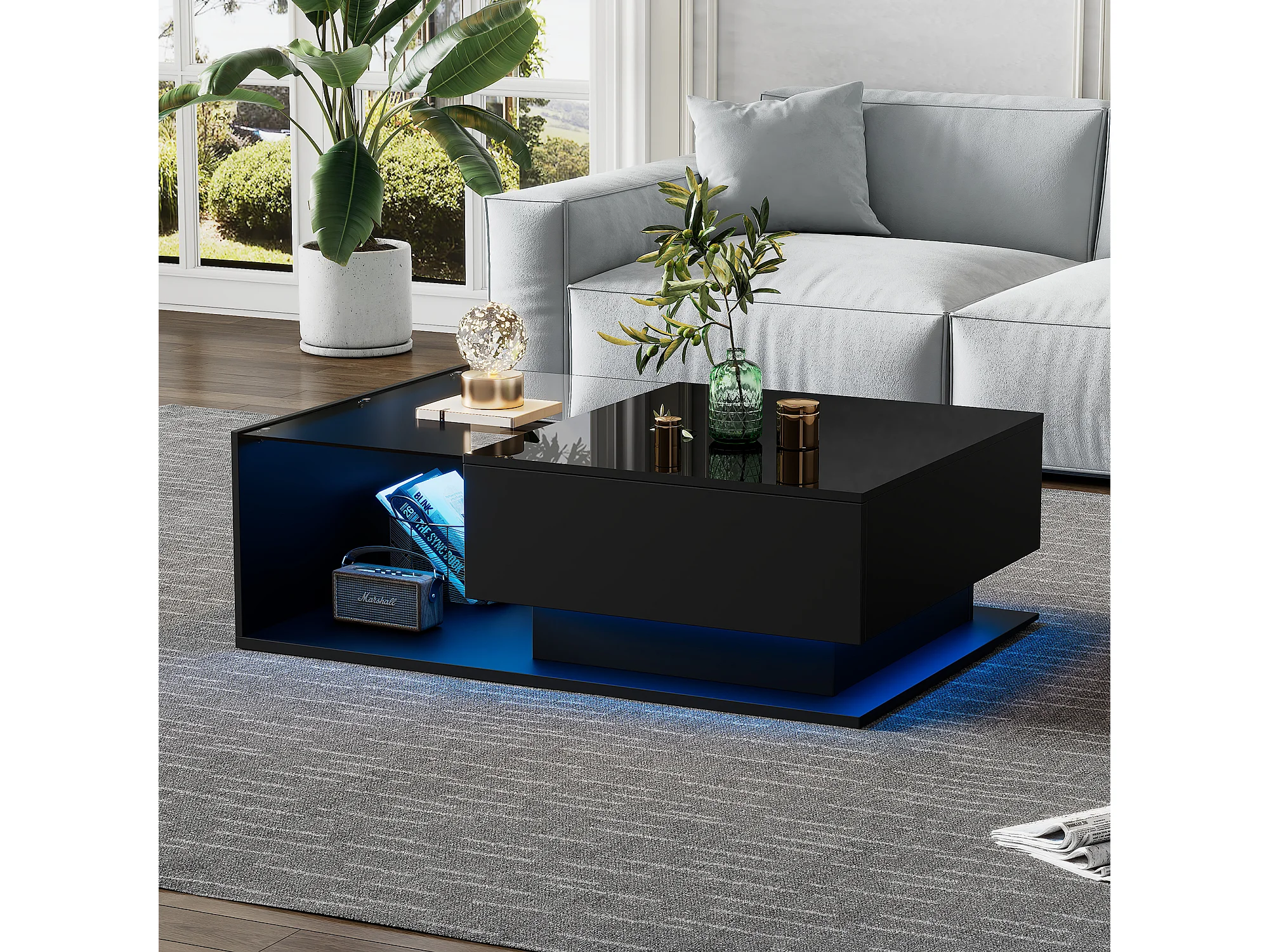 Salontafel 100x50x32 cm, LED-verlichting via app, 1 lade, glazen blad, zwarte spaanplaat