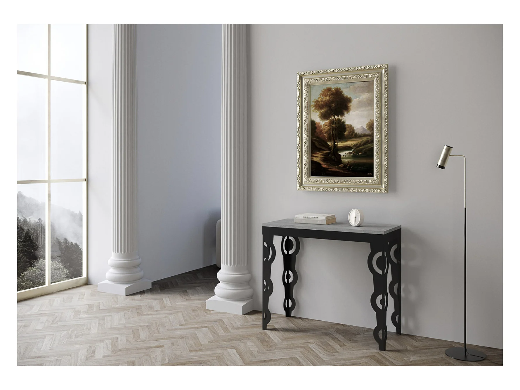 Flavio hout en ijzeren design uitschuifbare console 90x40/196 of 90x40/300 cm-Kleur Cementgrijs-Steun 2 voet-Verlengsnoeren 5 dikke extensies