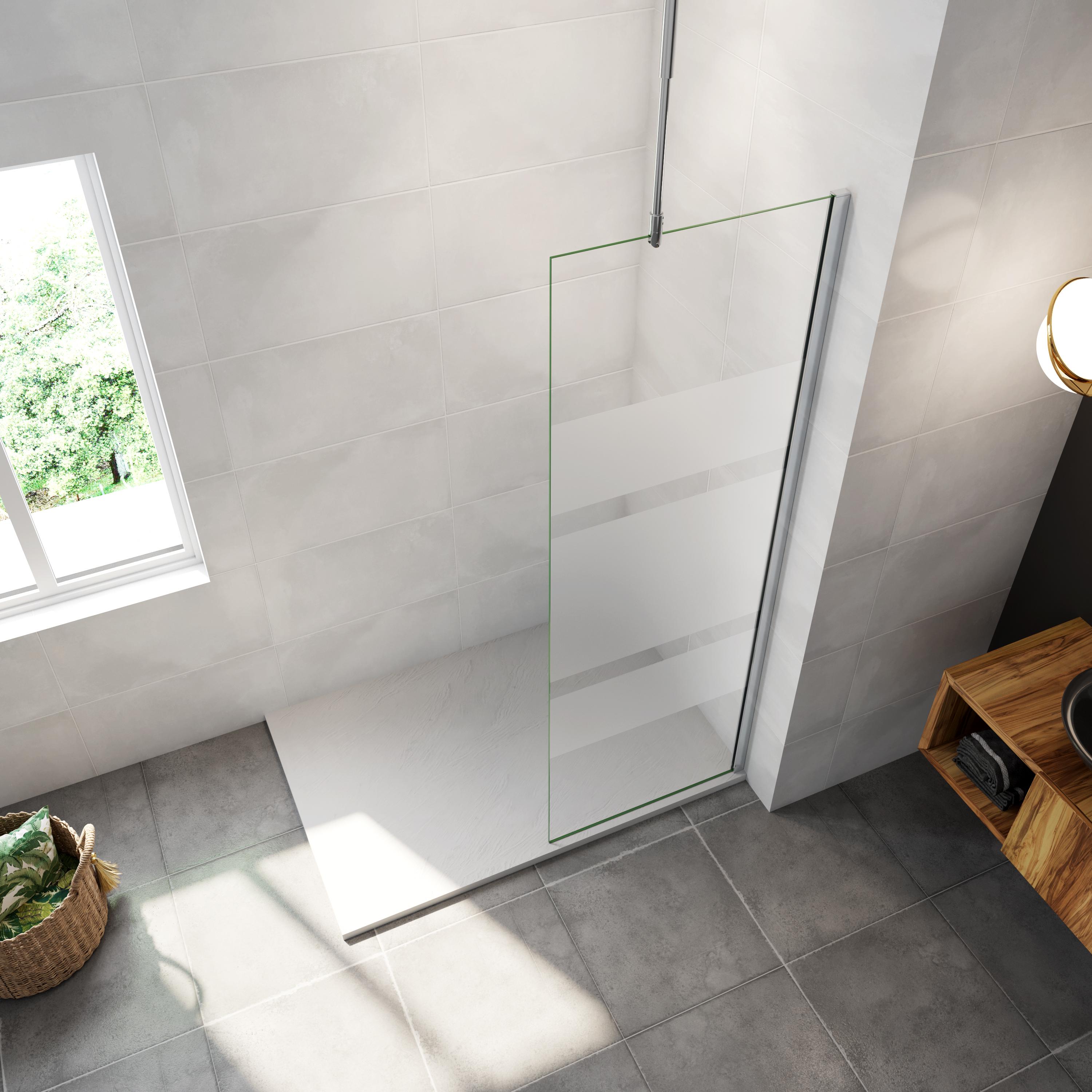 AICA inloopdouchewand chroom 60x190cm, 6mm antikalk glas met horizontale zeefdrukbanden, 90cm vierkante bevestigingsstang
