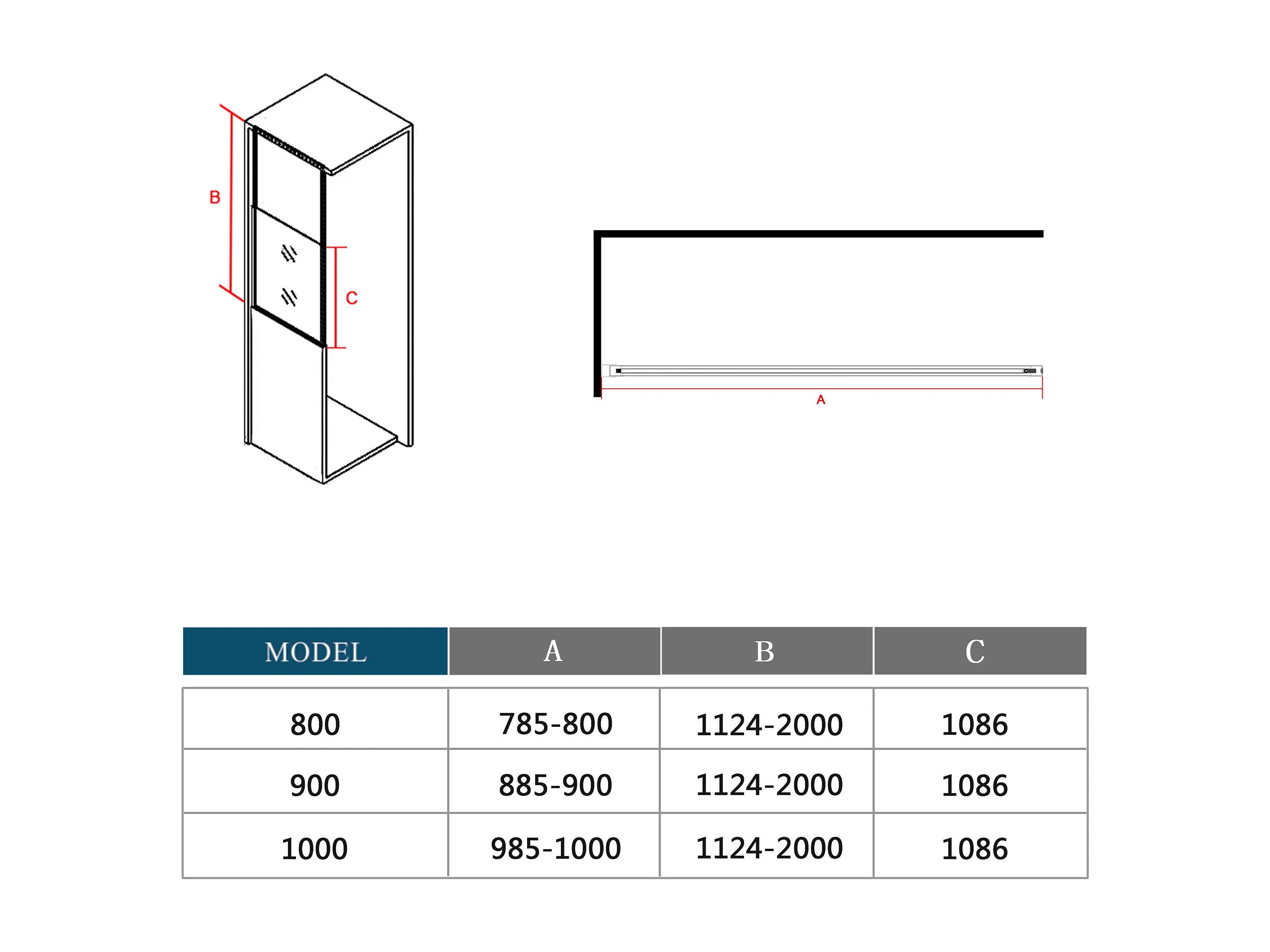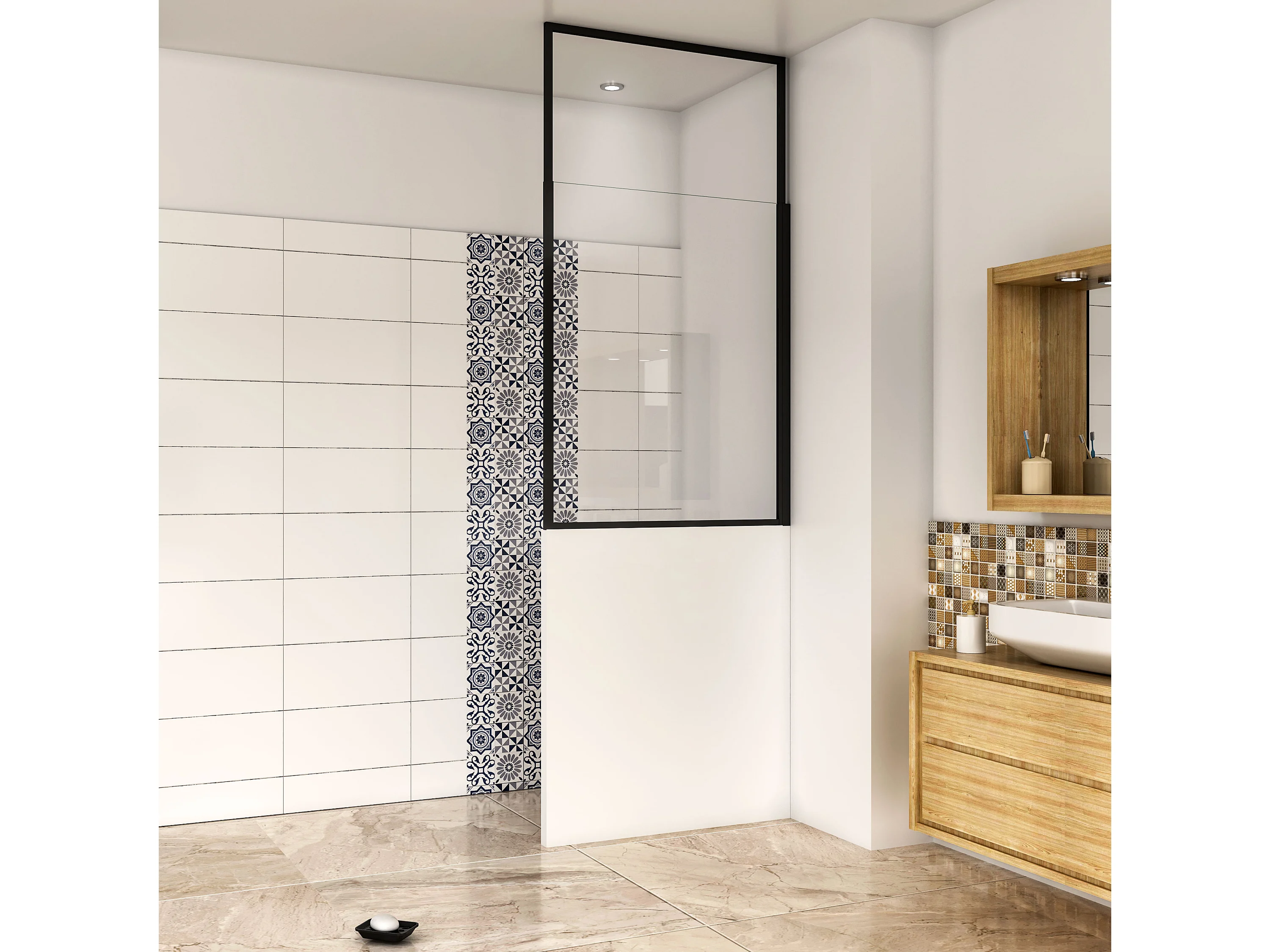 AICA Zwart wandscherm 90x110cm, 6mm antikalk glas, Zwart badscherm, industriële stijl en discrete industriële touch