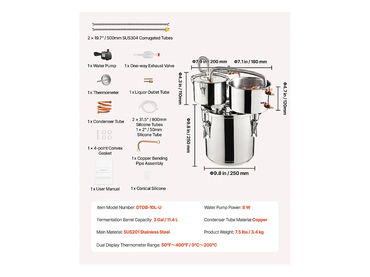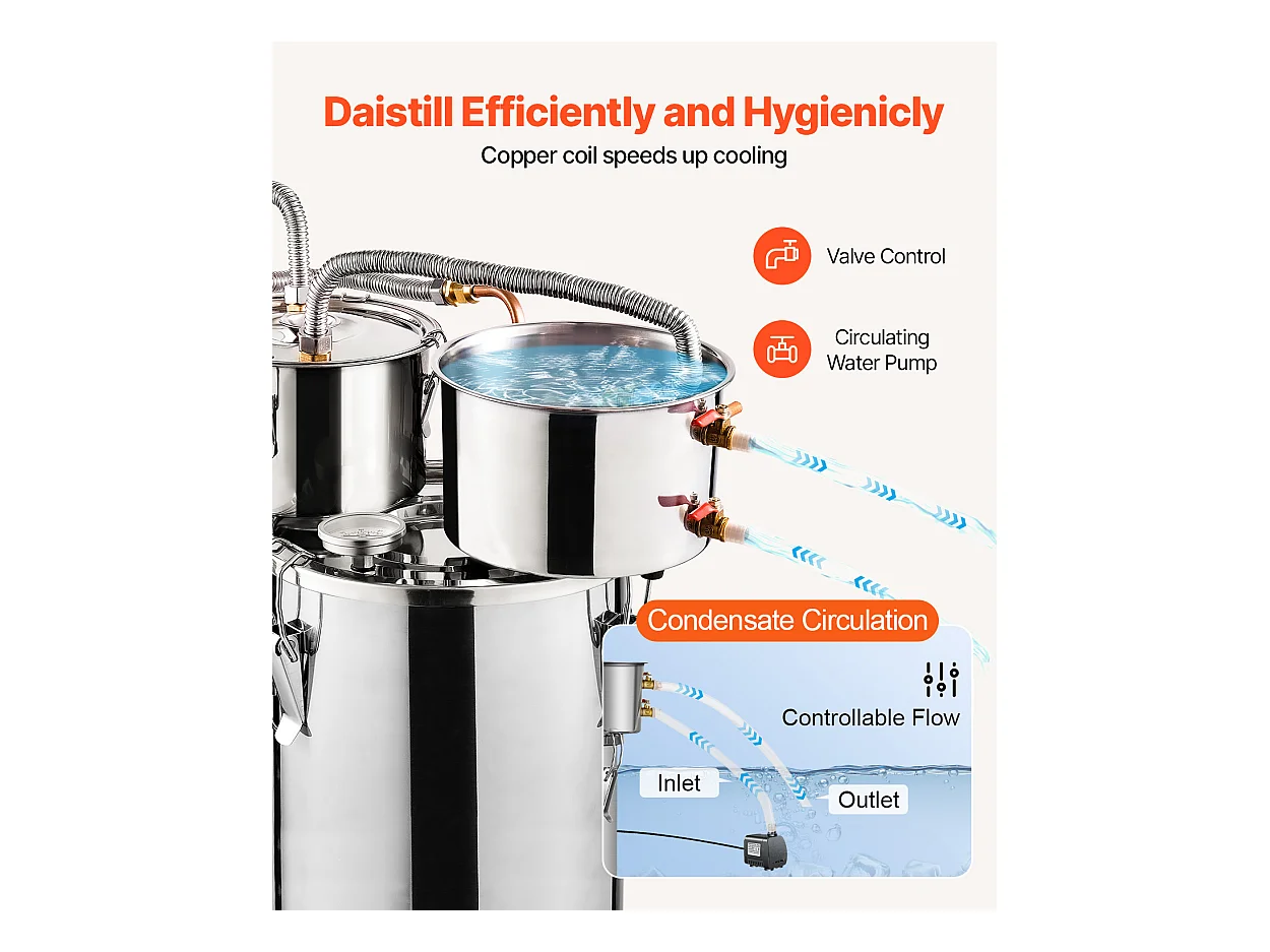 Alcohol Distilleerder SucceBuy 11L Distilleerset voor Plat Water met Thumper-vat en 8W Waterpomp