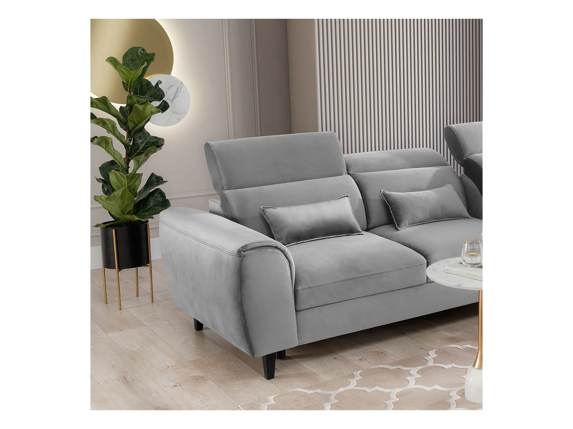 NOBLESSE omvormbare hoekbank met fluwelen opbergruimte - Zwarte houten poten-Kleur Lichtgrijs-linkerhoek