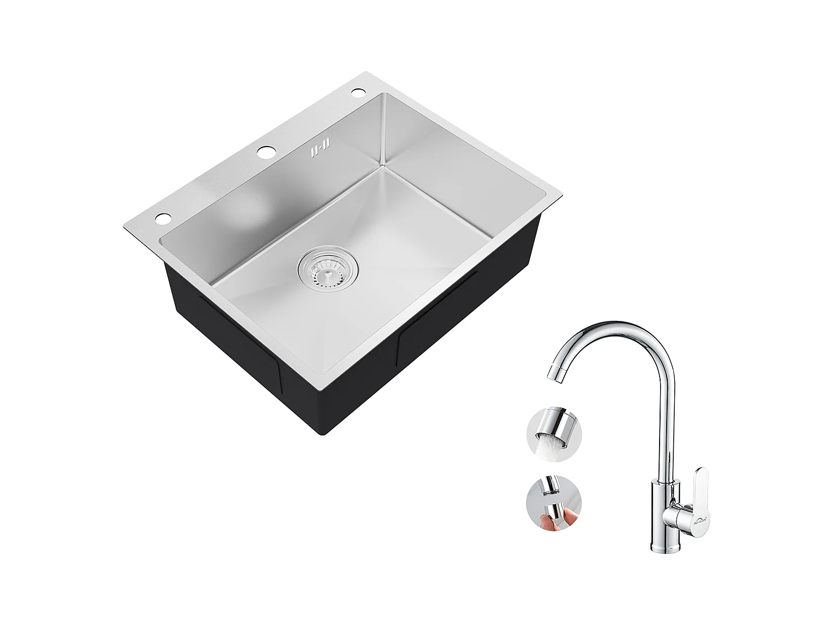 Auralum max Inbouw Keukenspoelbak,1 Bak,60*49*20CM,304 RVS Spoelbak,Zilver+Keukenkraan, 360° Richtbaar,Warm/Koud Water,In Messing,Chroom