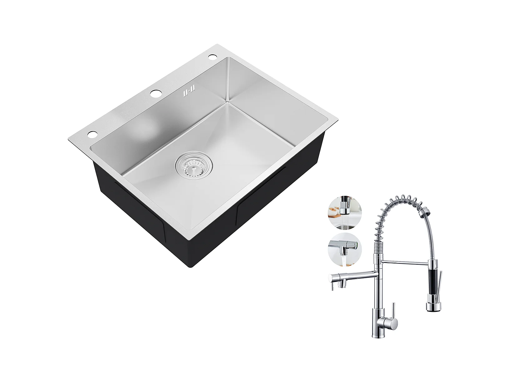Auralum max Inbouw Keukenspoelbak,1 Bak,60*49*20CM,In 304 RVS,Zilver+Koedkraan met Uitschuifbare Handdouche, 360° Draaibaar,2 Modi,Geborsteld