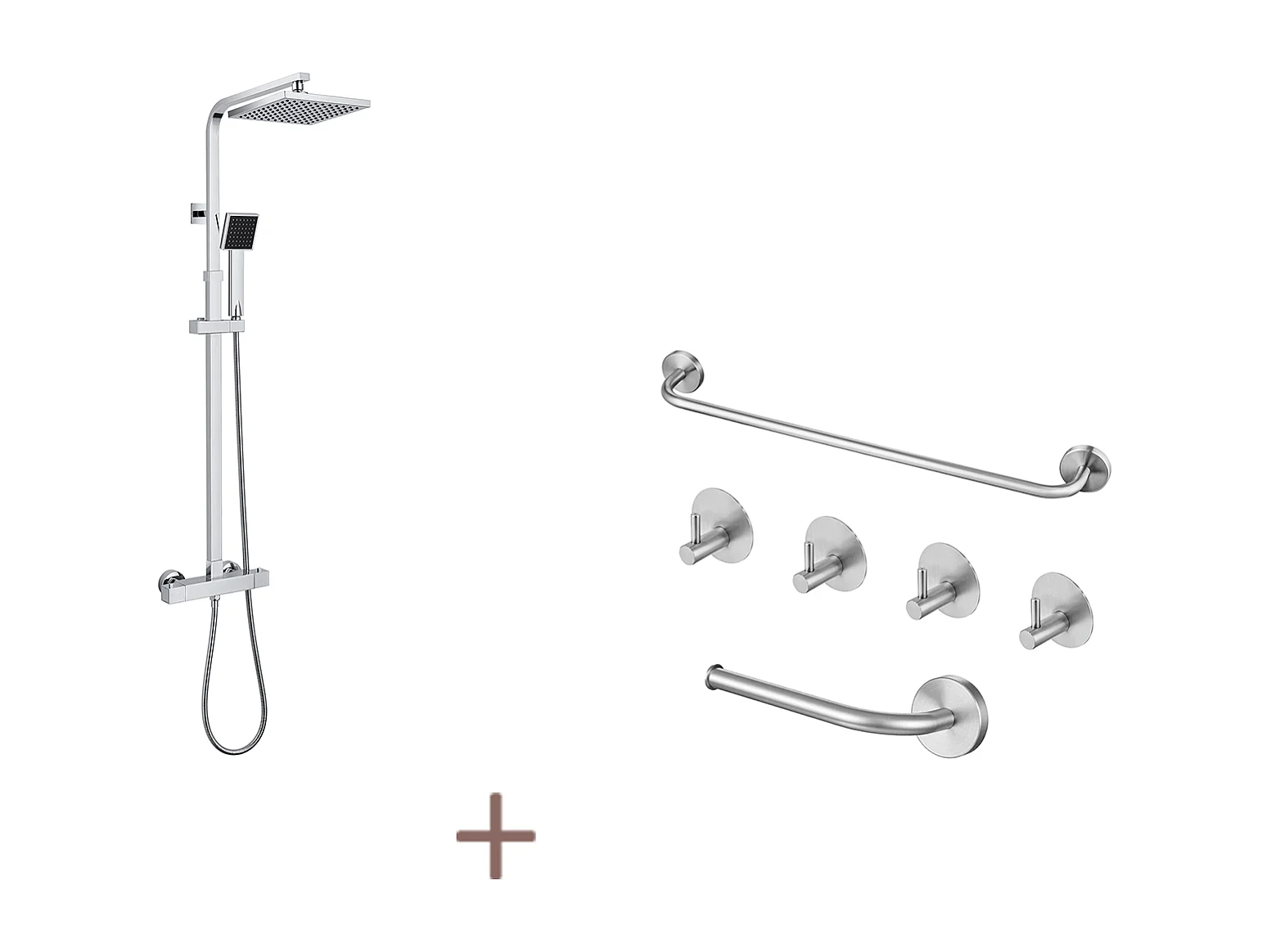 Auralum max Vierkante thermostatische douchekolom, messing body douchesysteem + badkamerset 6-delig accessoire, roestvrij staal, geborsteld