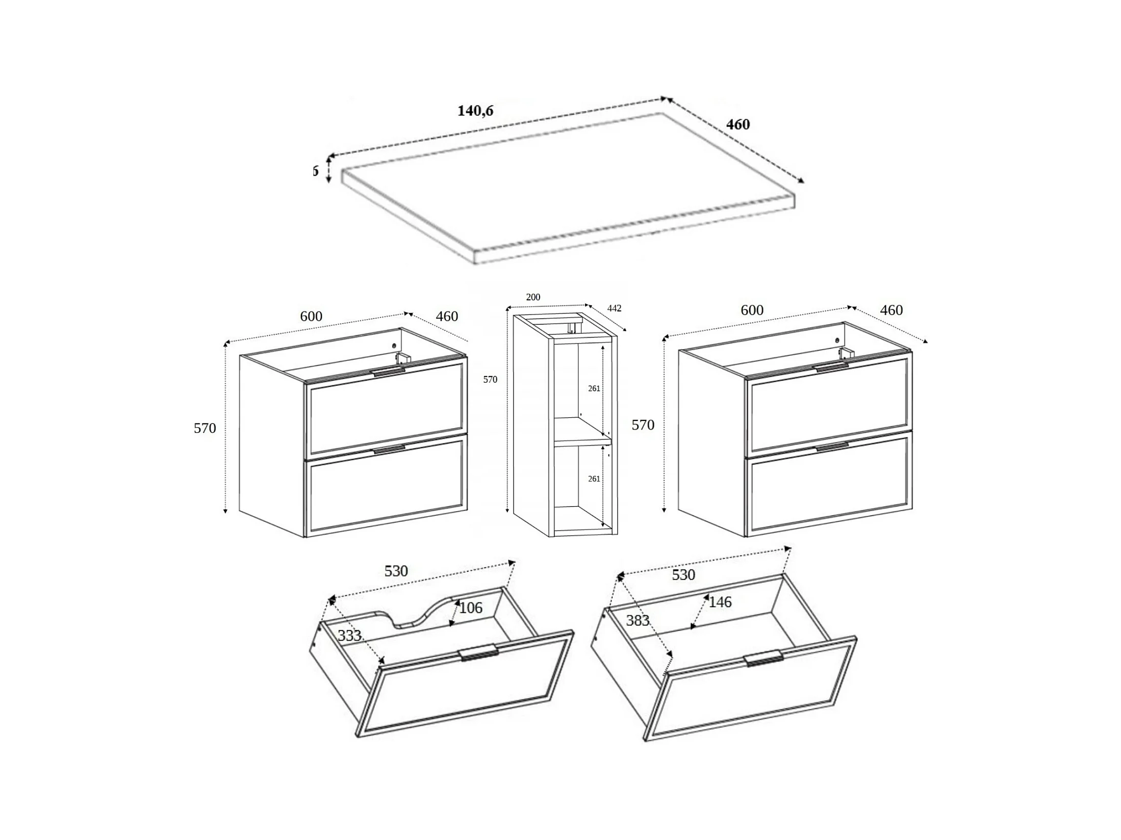 Badkamerkast, Craft Eik / Donkergrijs, gouden greep, 140 (2 x 60 + 20) x 46 x 57 cm