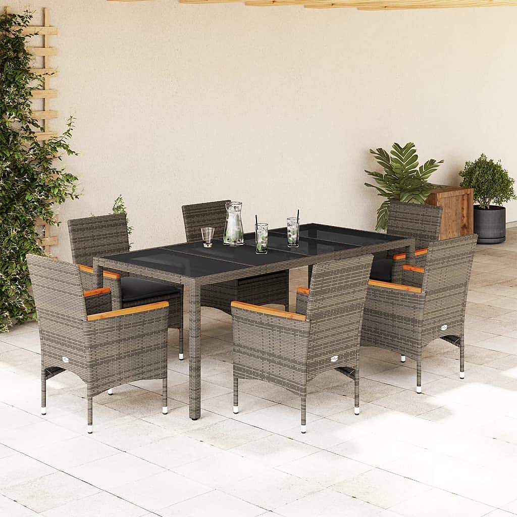 Bakersfield 7-delige Tuinset met kussens poly rattan en glas grijs
