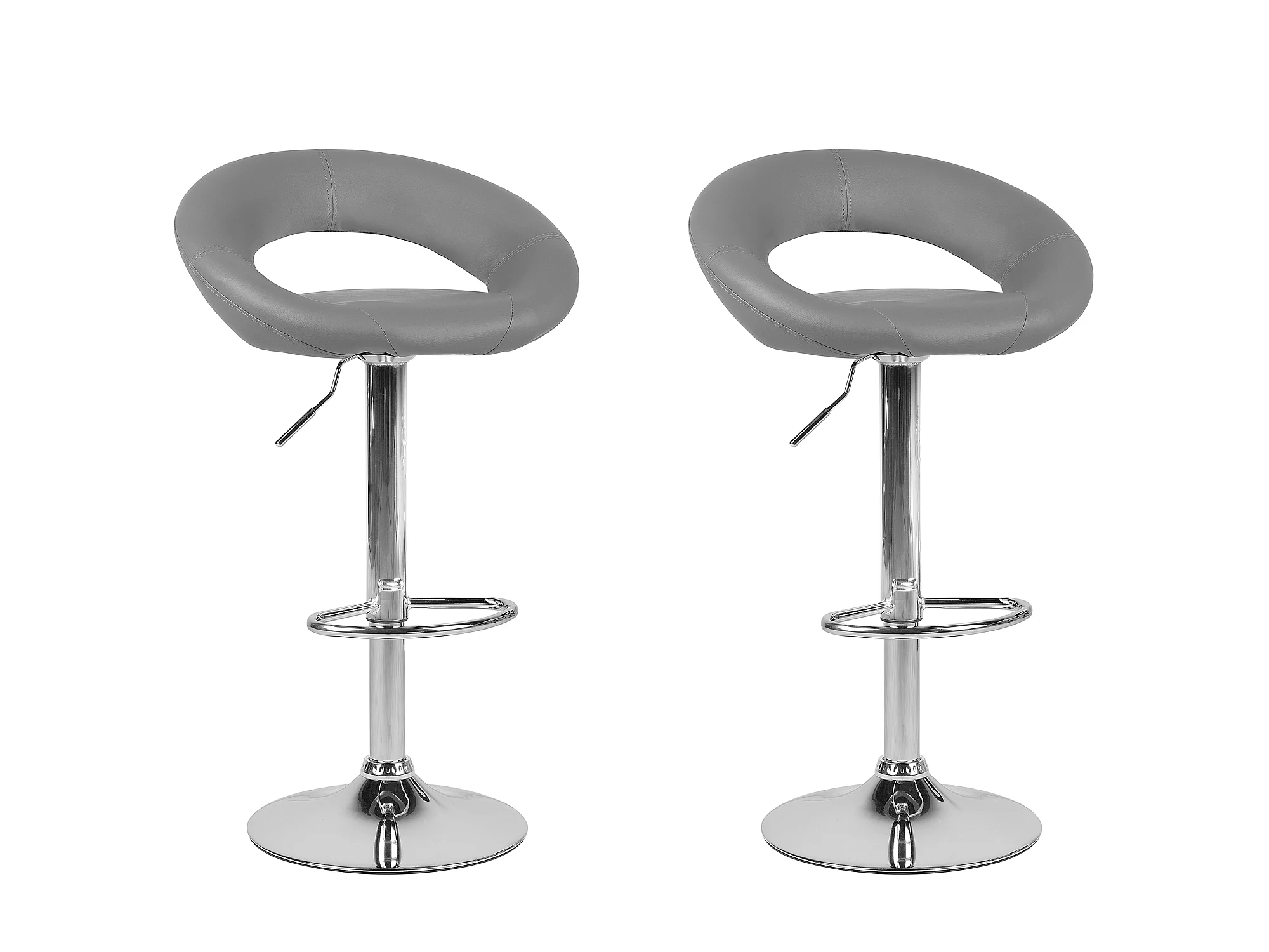 Set van 2 verstelbare barkrukken, hoogte 77-97 cm - Zitting van grijs PU kunstleer, grijze metalen voet, diameter 40 cm