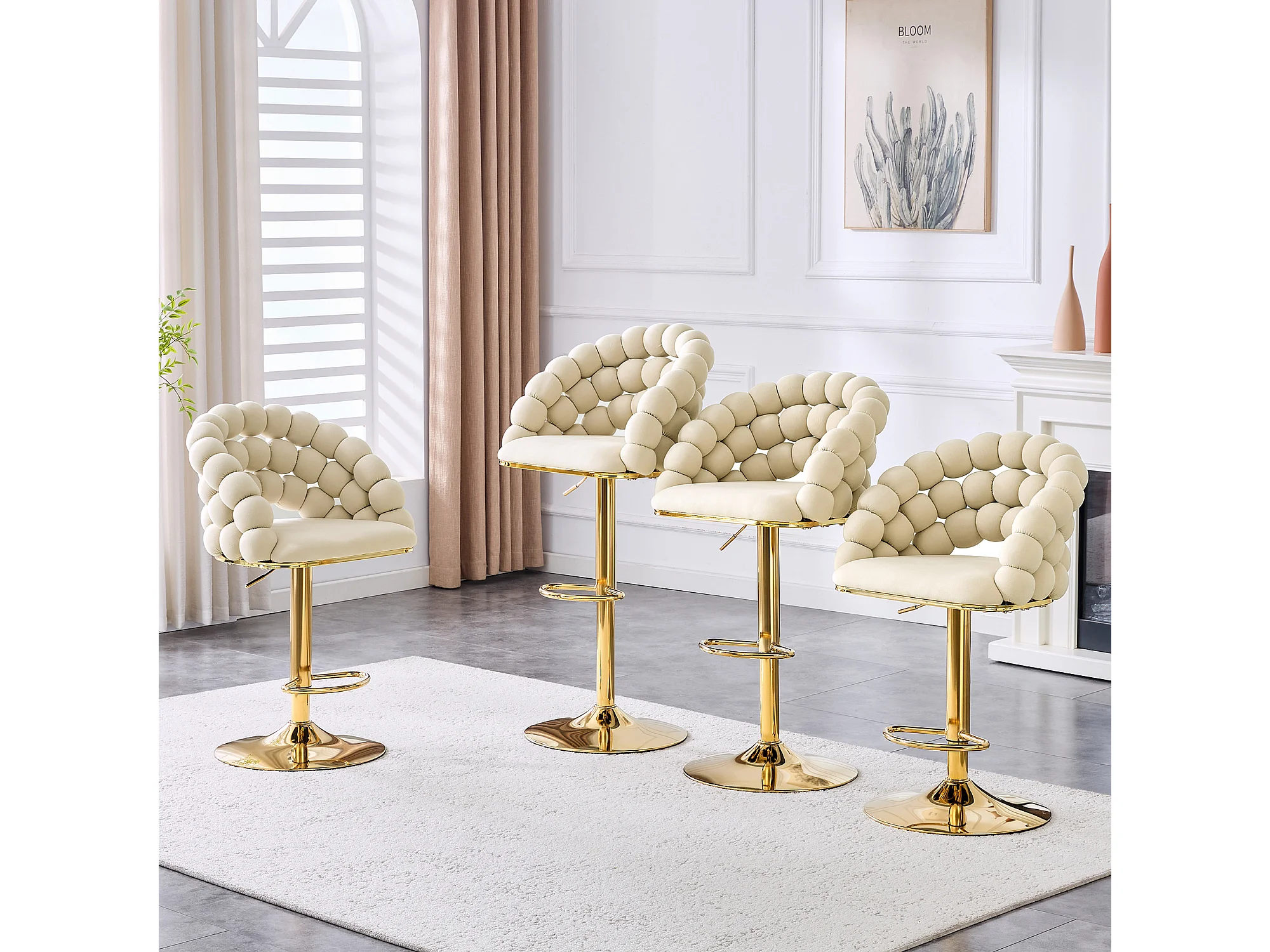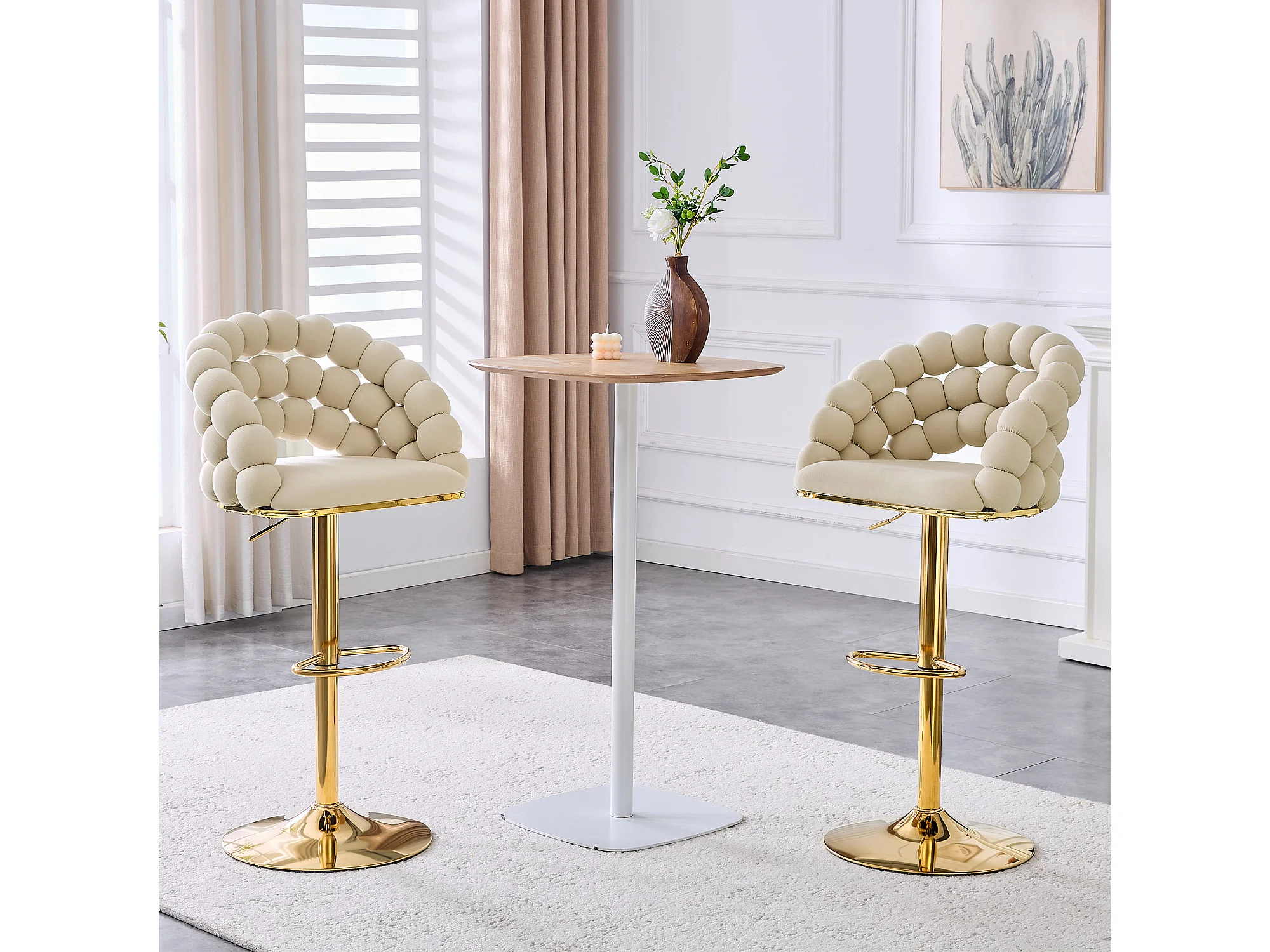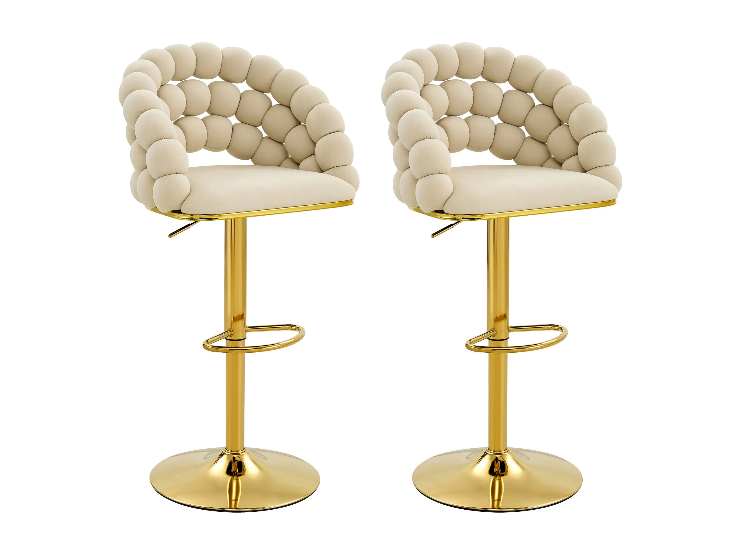 Set van 2 barkrukken, in hoogte verstelbaar 65-112 cm, rugleuning met kralenkettingen, comfortabele zitting, metaal en fluweel, gebroken wit