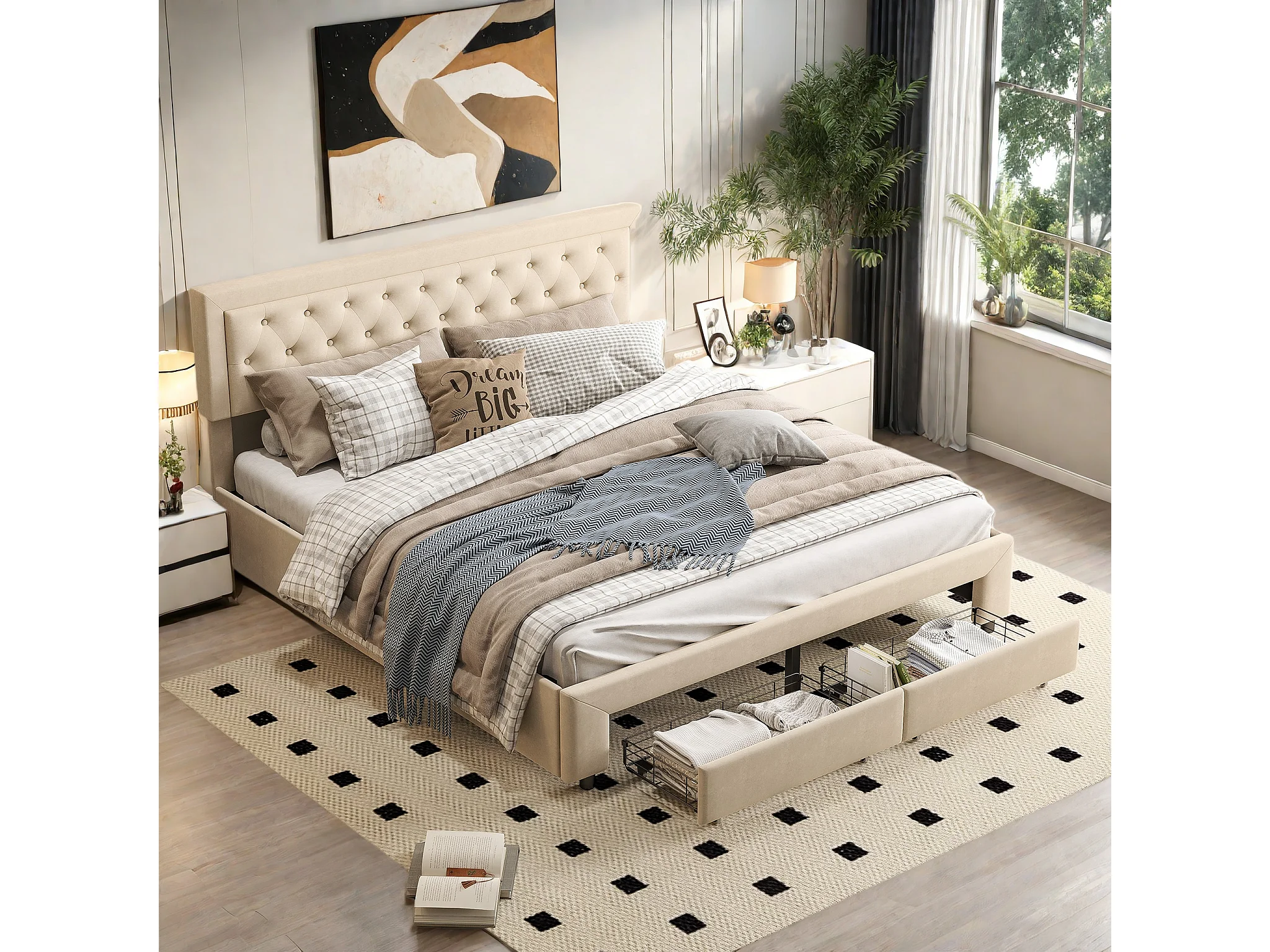Tweepersoonsbed 160x200cm in beige linnen met 3 lades, gestoffeerd bedframe - milieuvriendelijke stof, zacht en comfortabel, gemakkelijk te onderhouden