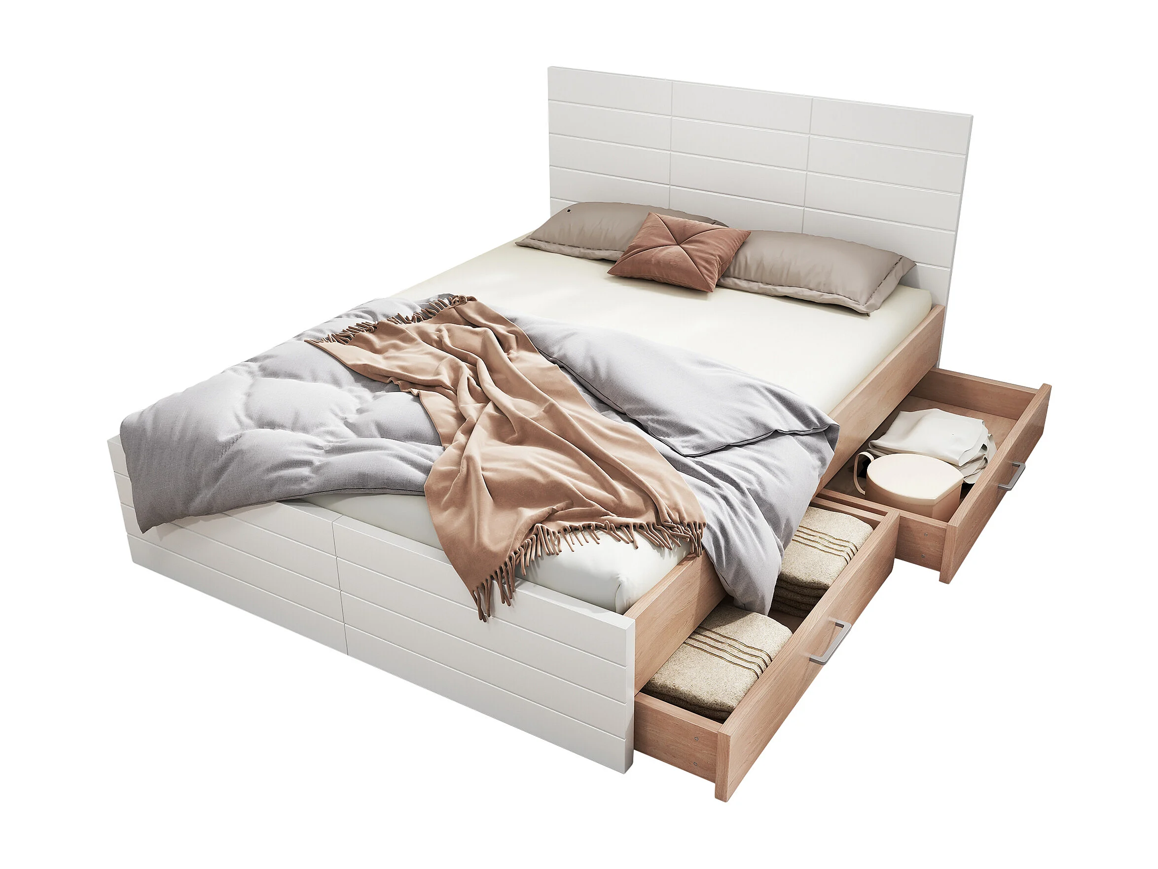Bed En Hout Tweepersoons 160x200 Cm, 2 Lades, Lattenbodem Inbegrepen, Tête Incluse, Cadre Modern Chêne/wit, Met Matras