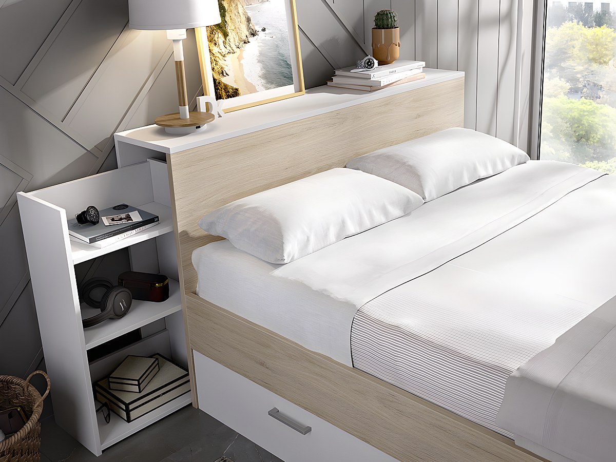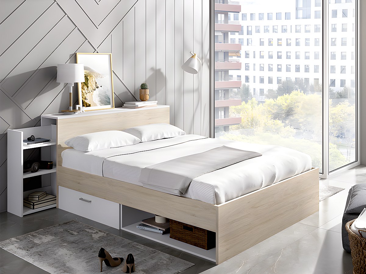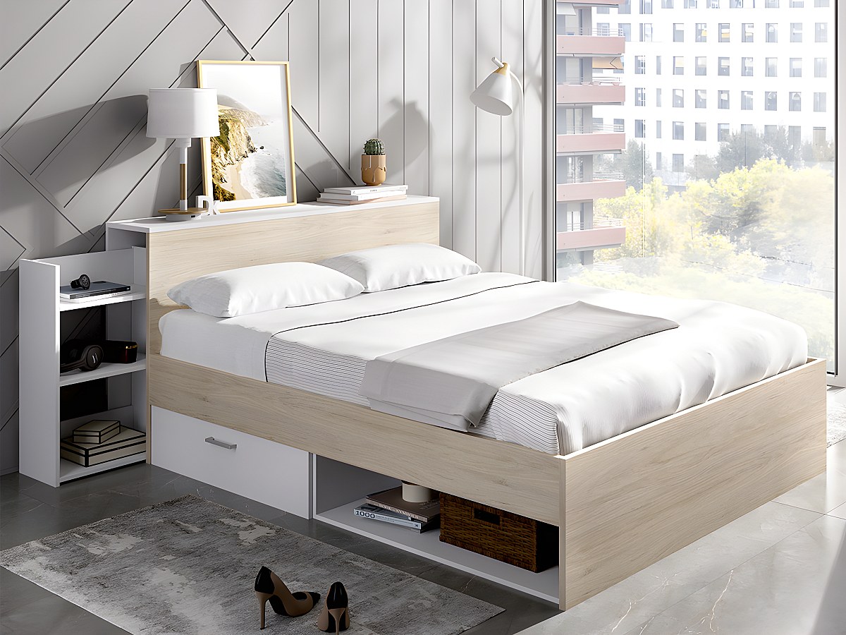Bed FLORIAN met hoofdeinde bed, opbergruimte en lades - 140 x 190 cm - Kleur: Wit en eiken