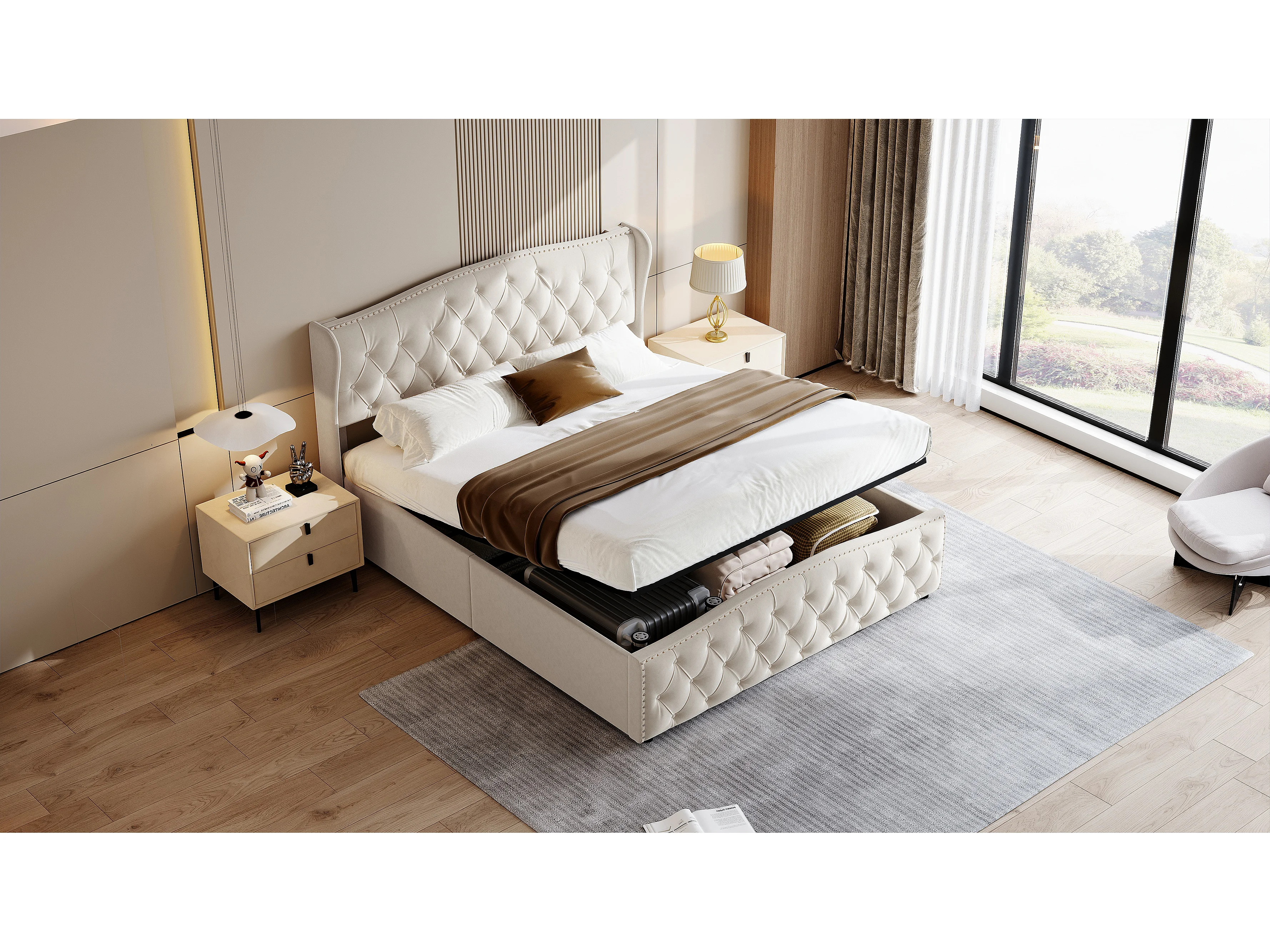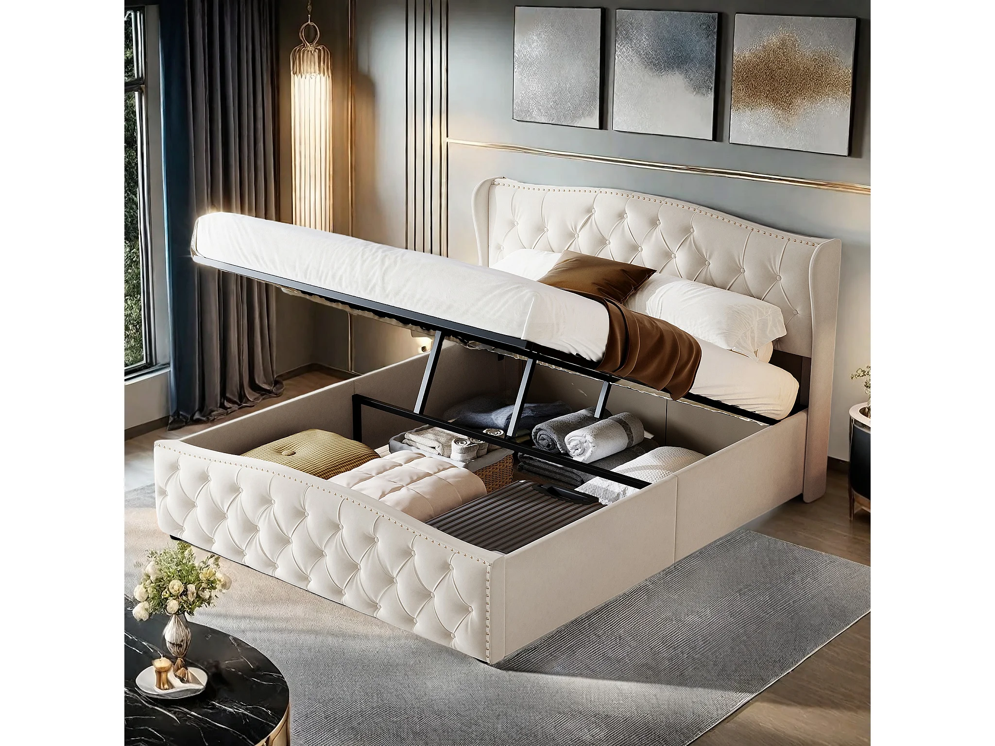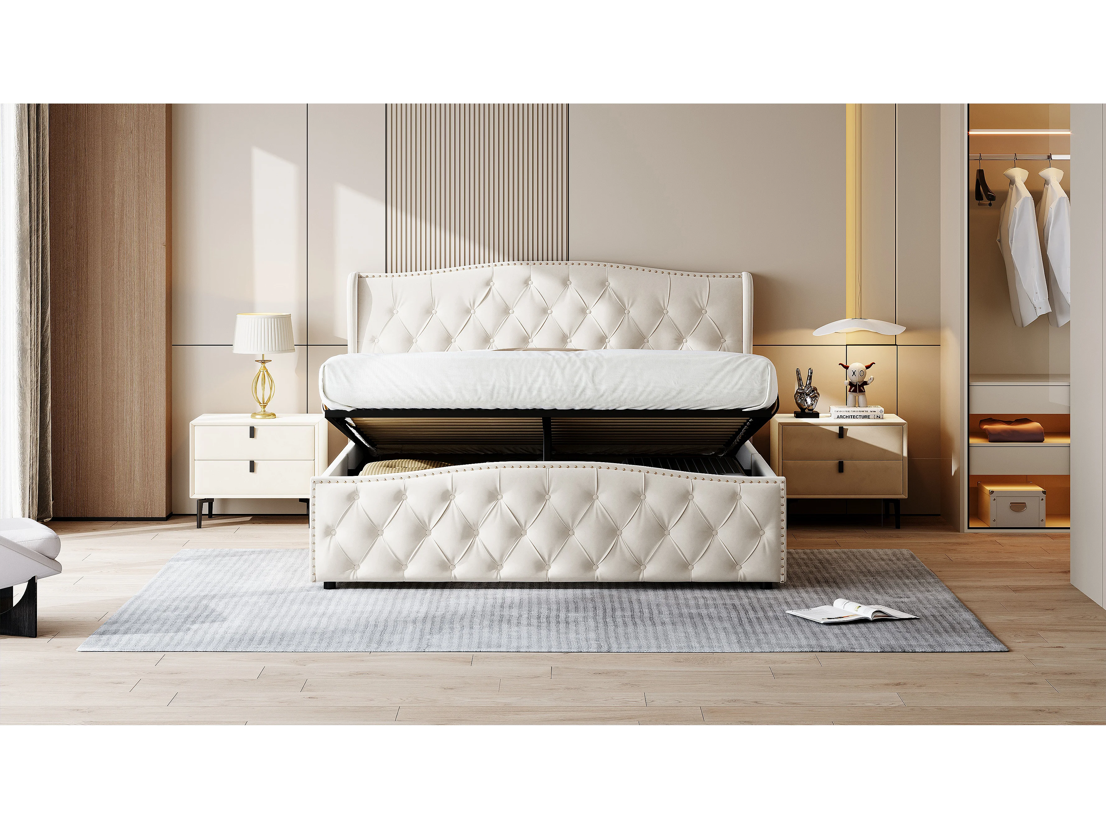 Bed in gebroken wit fluweel 140x200 cm met decoratieve studs en golfpatroon, tweepersoonsbed met lattenbodem en opbergruimte