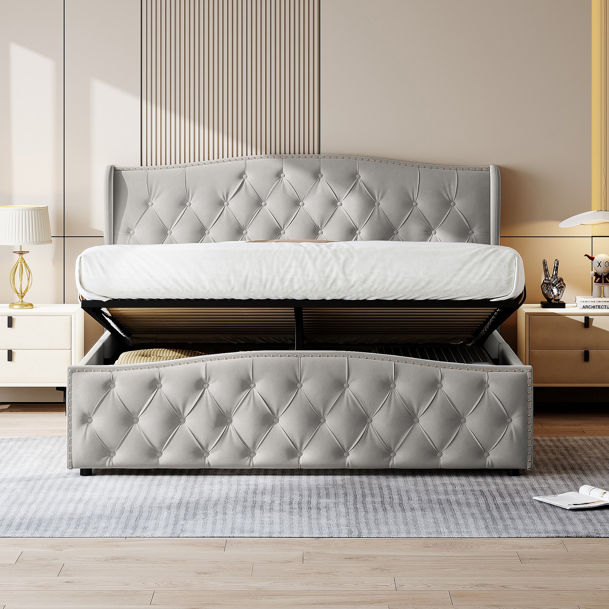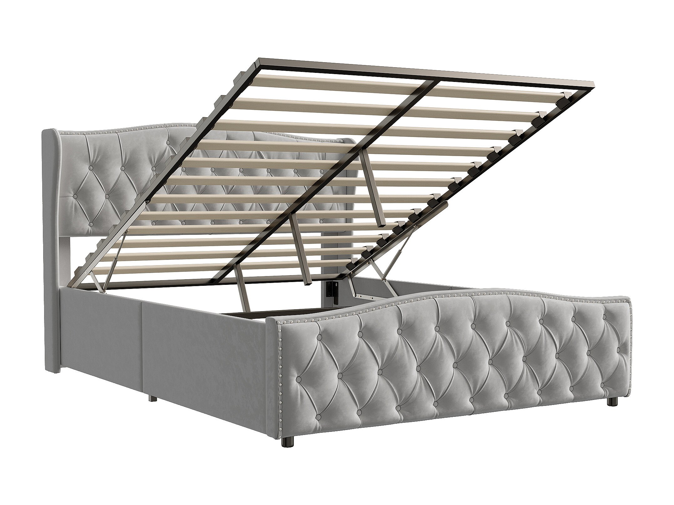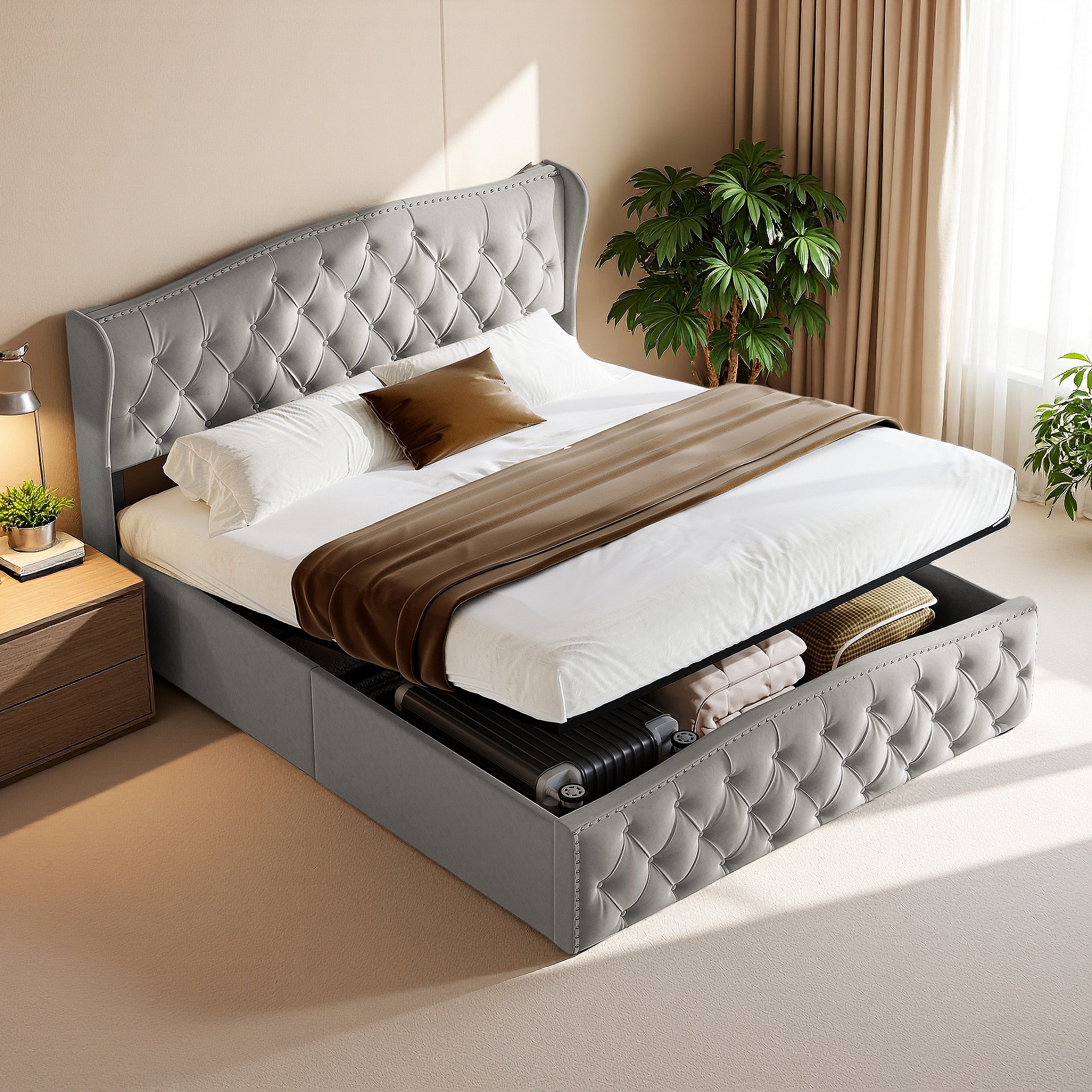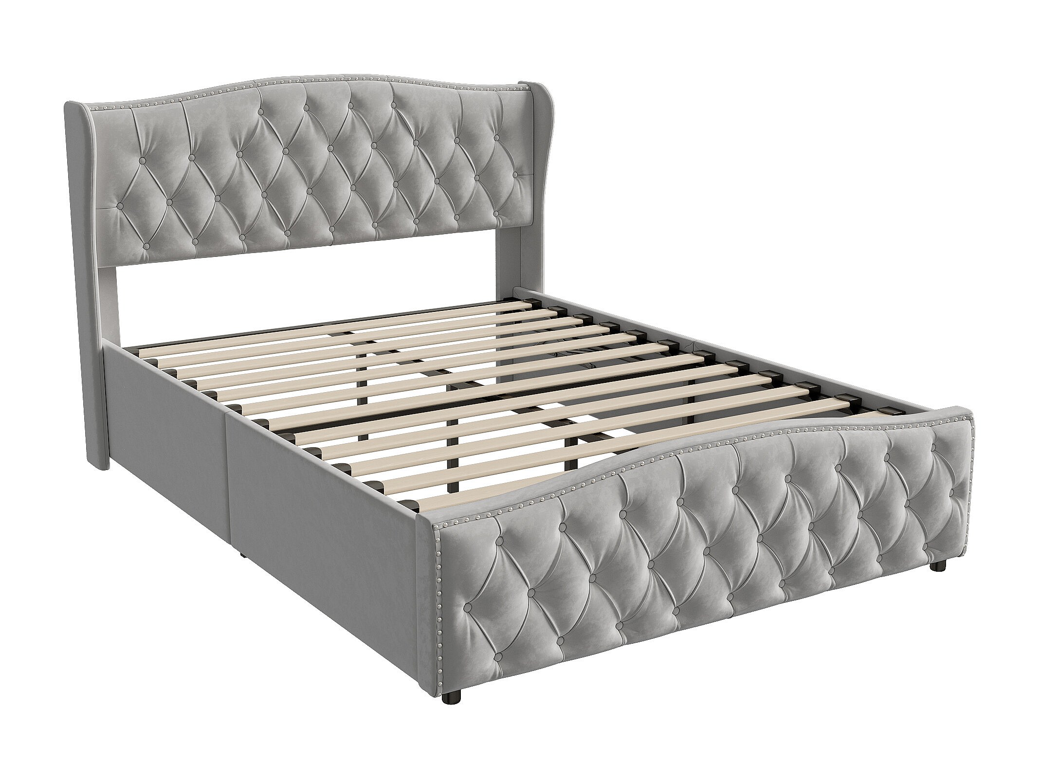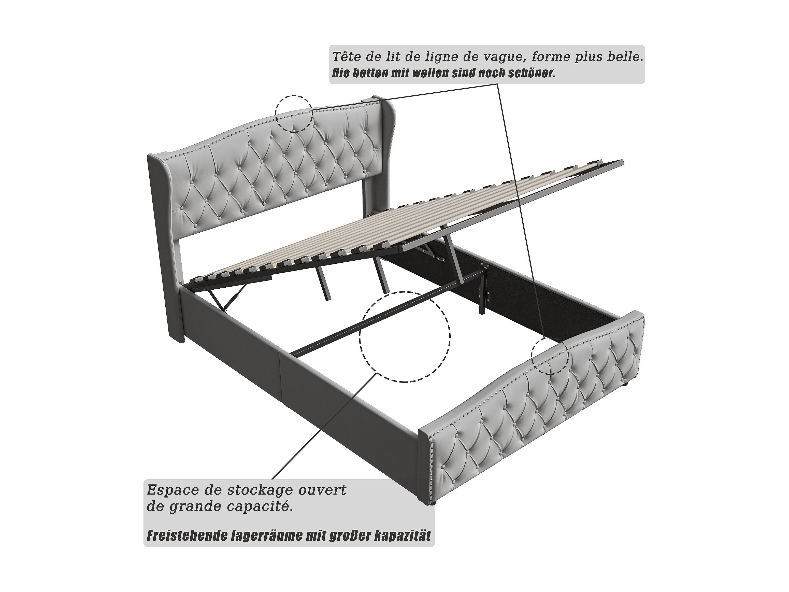 Bed in grijs fluweel 140x200 cm met decoratieve studs en golfpatroon, tweepersoonsbed met lattenbodem en opbergruimte