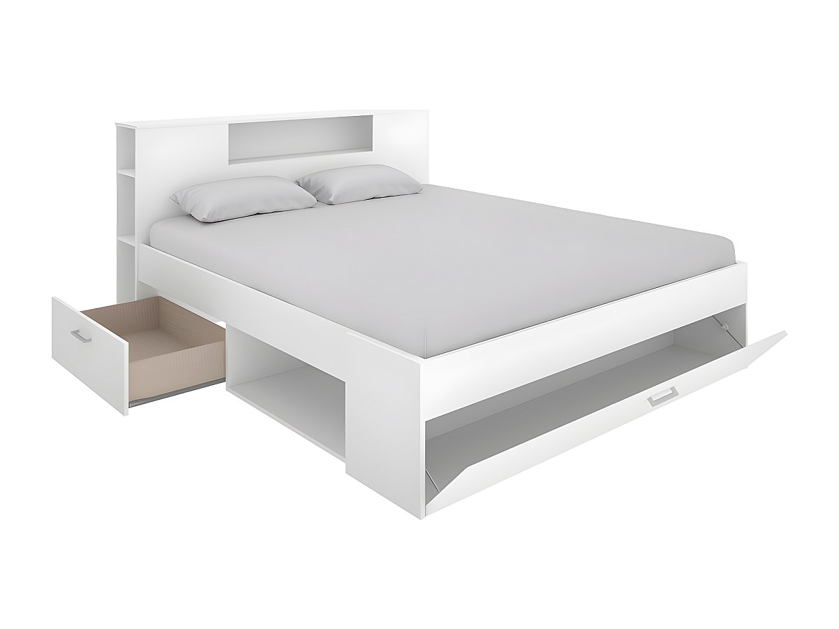 Bed LEANDRE met hoofdeinde bed, opbergruimte en lades - 140 x 190 cm - Kleur: wit