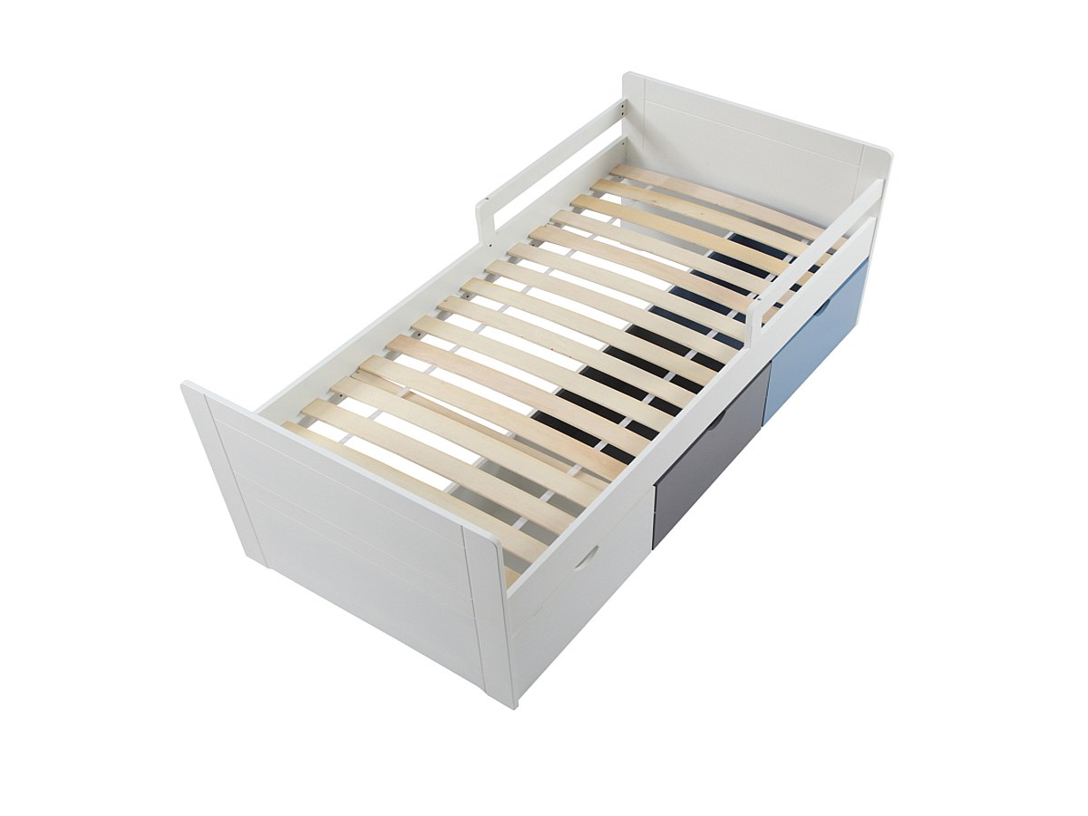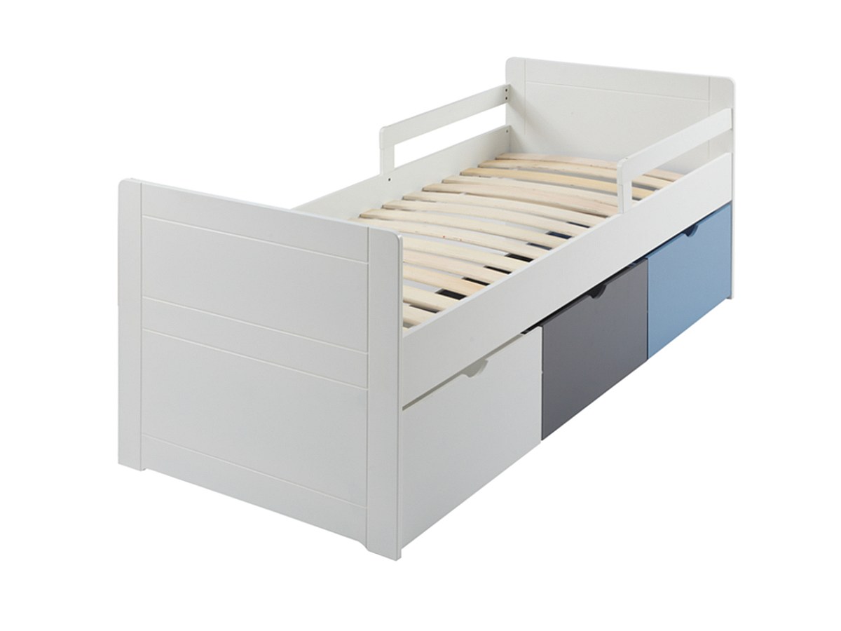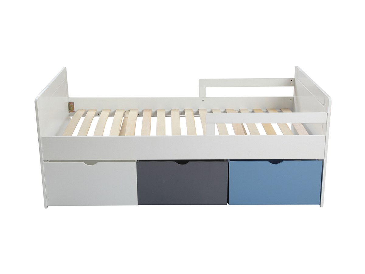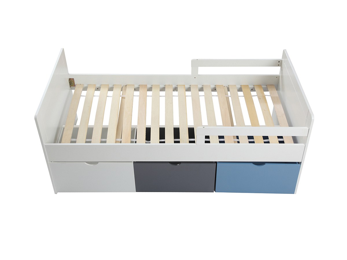 Bed met 3 laden PILOU - 90x190cm - MDF wit, grijs, blauw