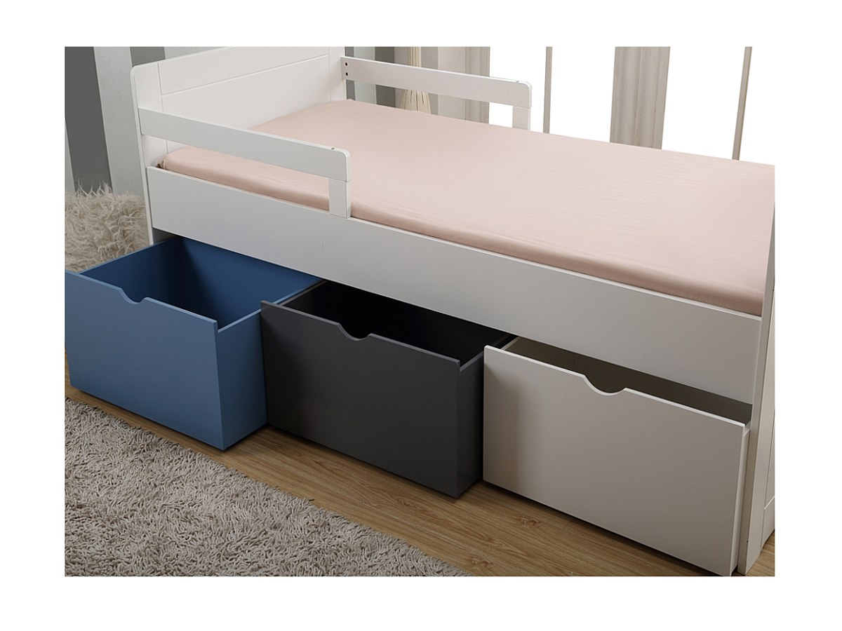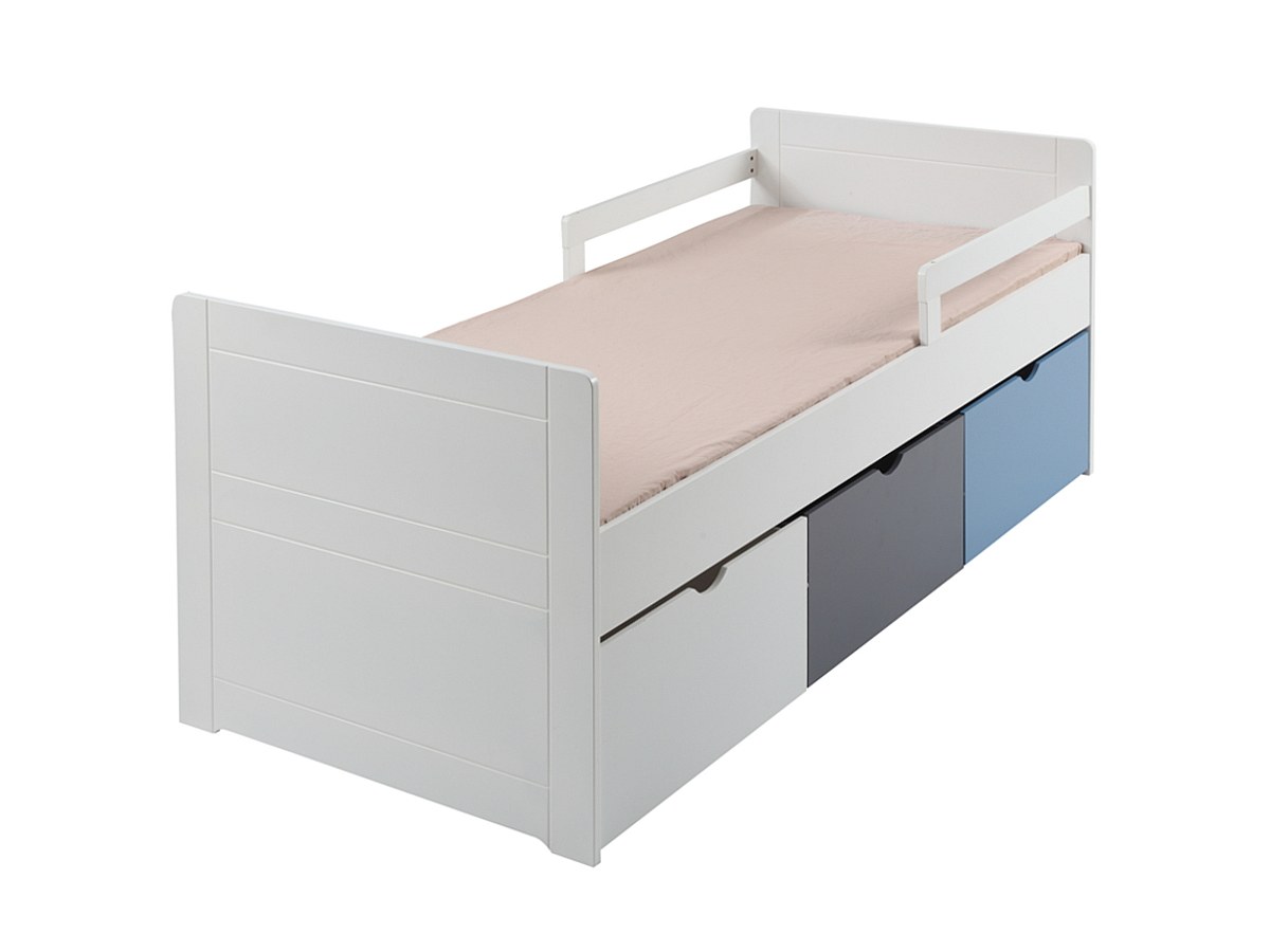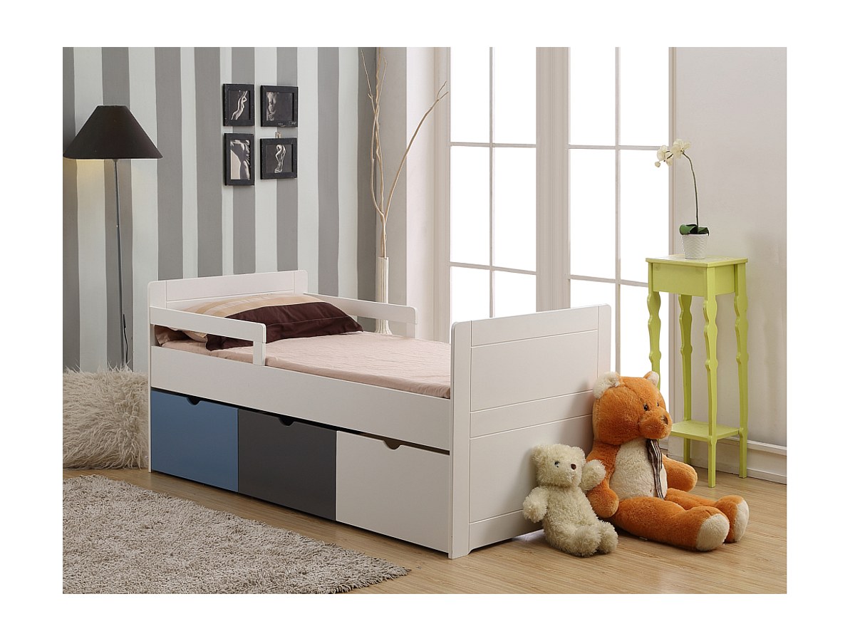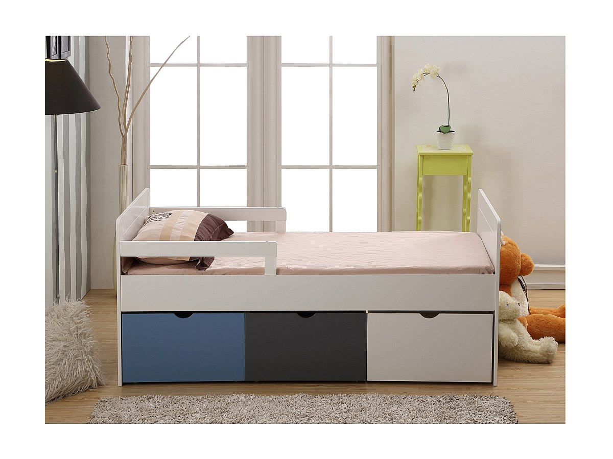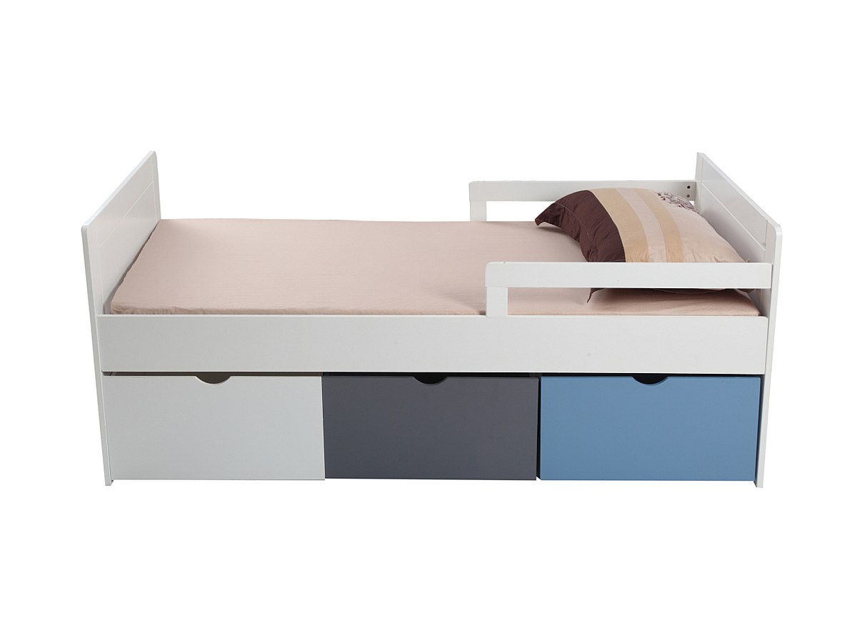 Bed met 3 laden PILOU - 90x190cm - MDF wit, grijs, blauw