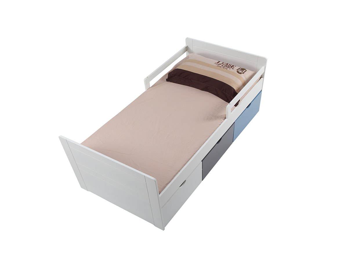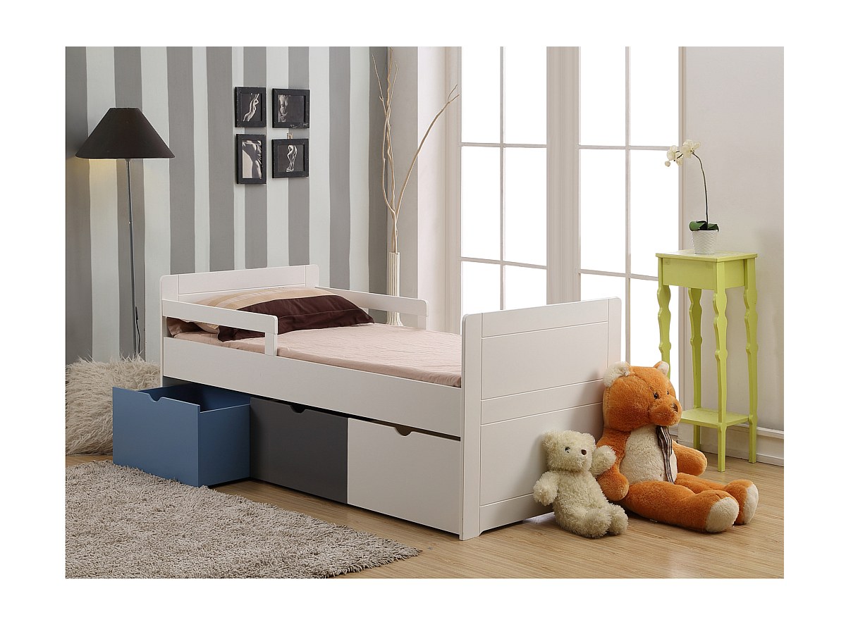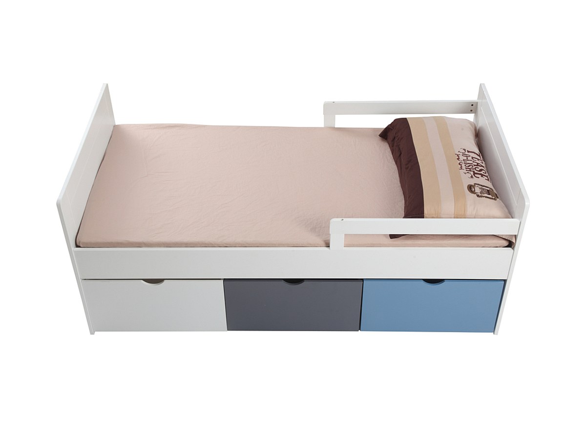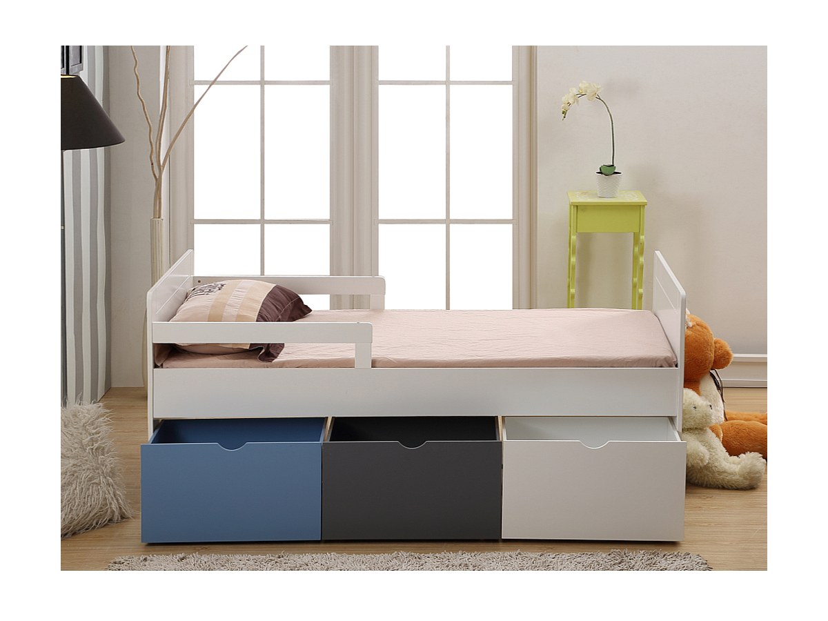 Bed met 3 laden PILOU - 90x190cm - MDF wit, grijs, blauw