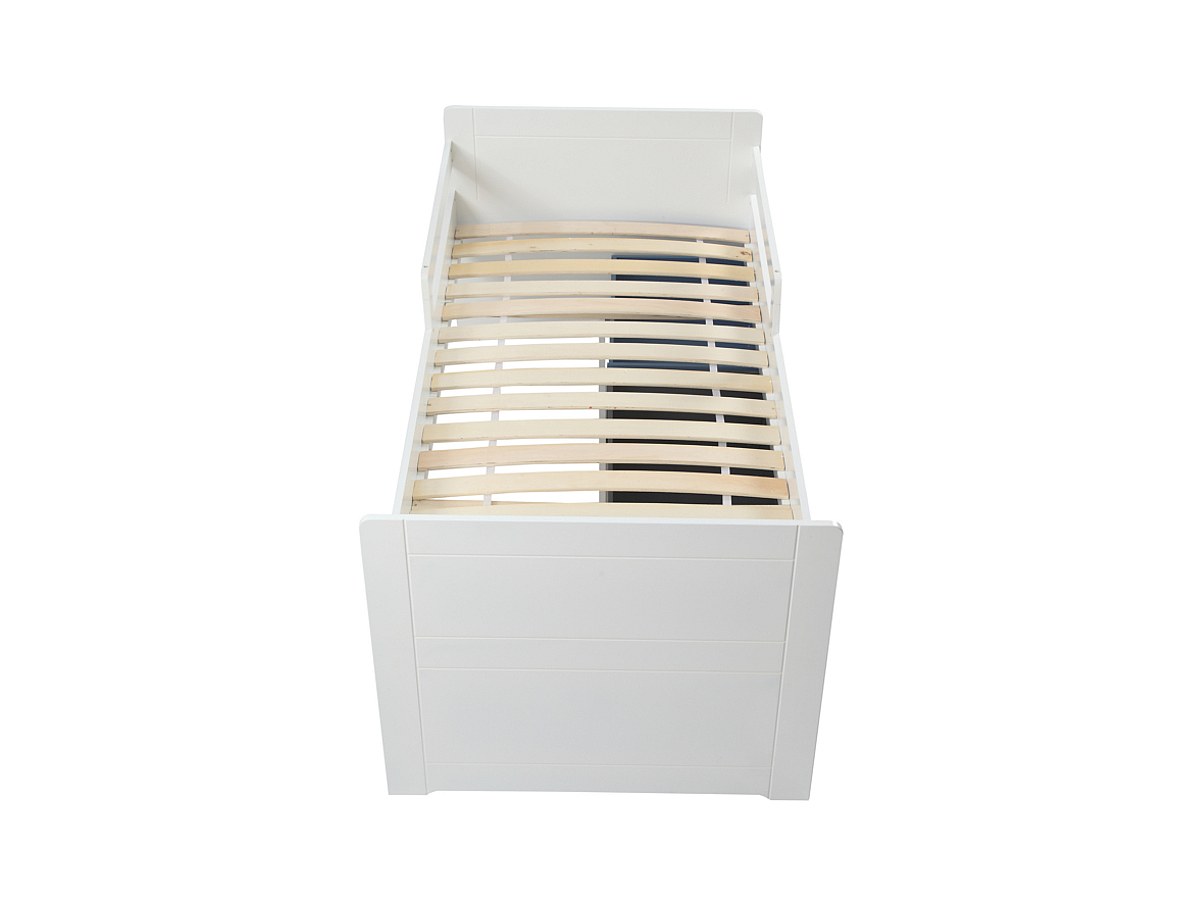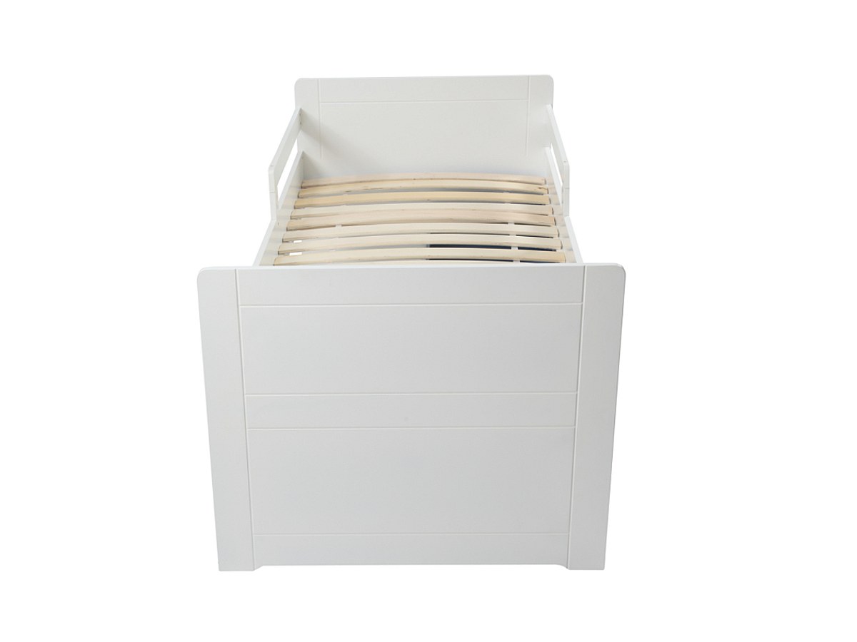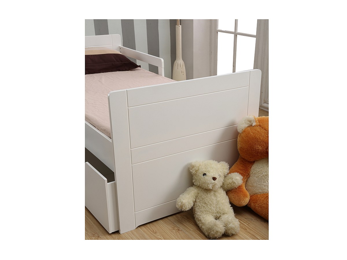 Uw kind zal heerlijk rustig slapen in dit bed met 3 grote laden en veiligheidshekjes in zachte kleuren.