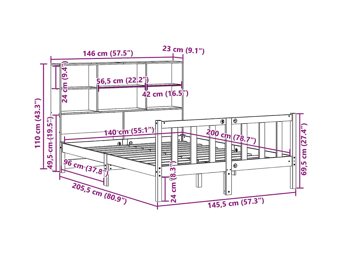 Bed met boekenkast zonder matras massief grenenhout 140x200 cm