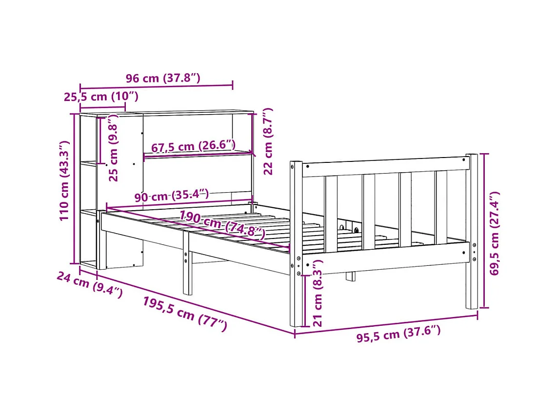 Bed met boekenkast zonder matras grenenhout wit 90x190 cm