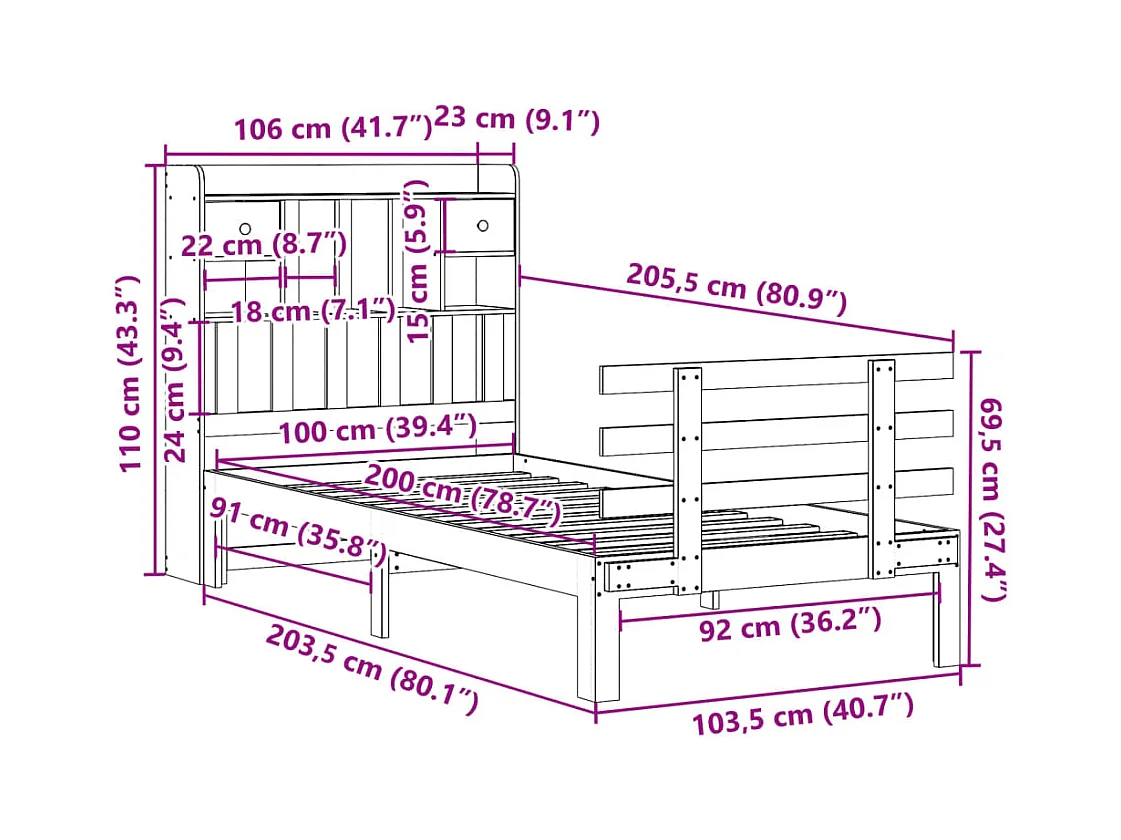 Bed met boekenkast zonder matras massief grenenhout 100x200 cm