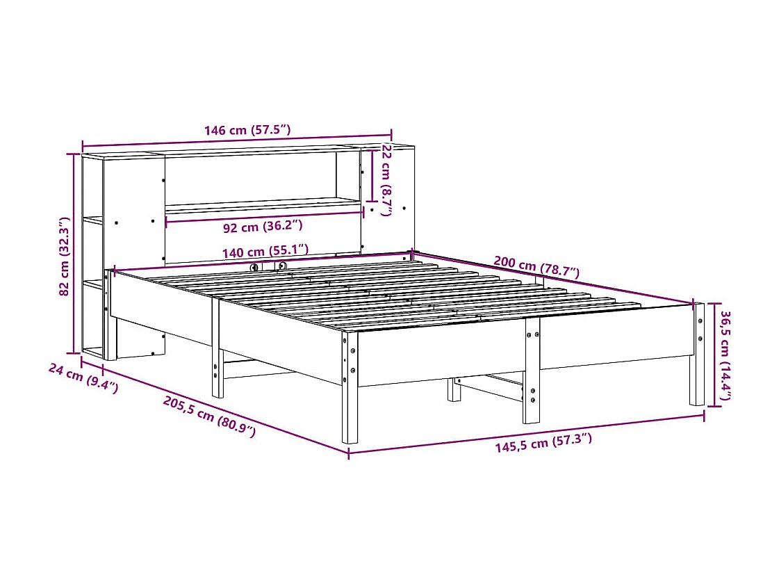 Bed met boekenkast zonder matras massief grenenhout 140x200 cm
