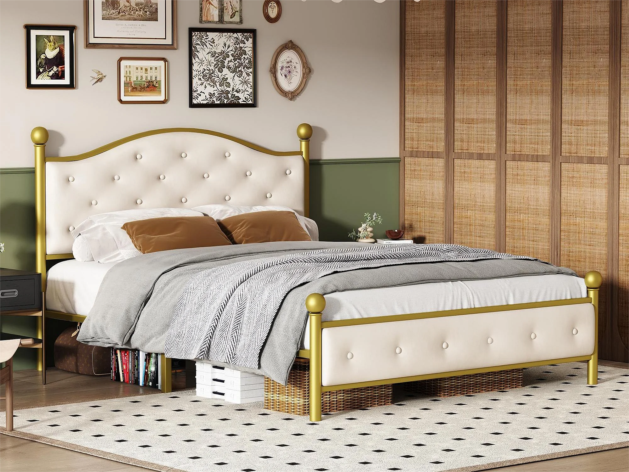 Bed met gewatteerd hoofdeinde - 140 x 200 cm - metaal - lattenbodem - elegante stijl - wit en goud