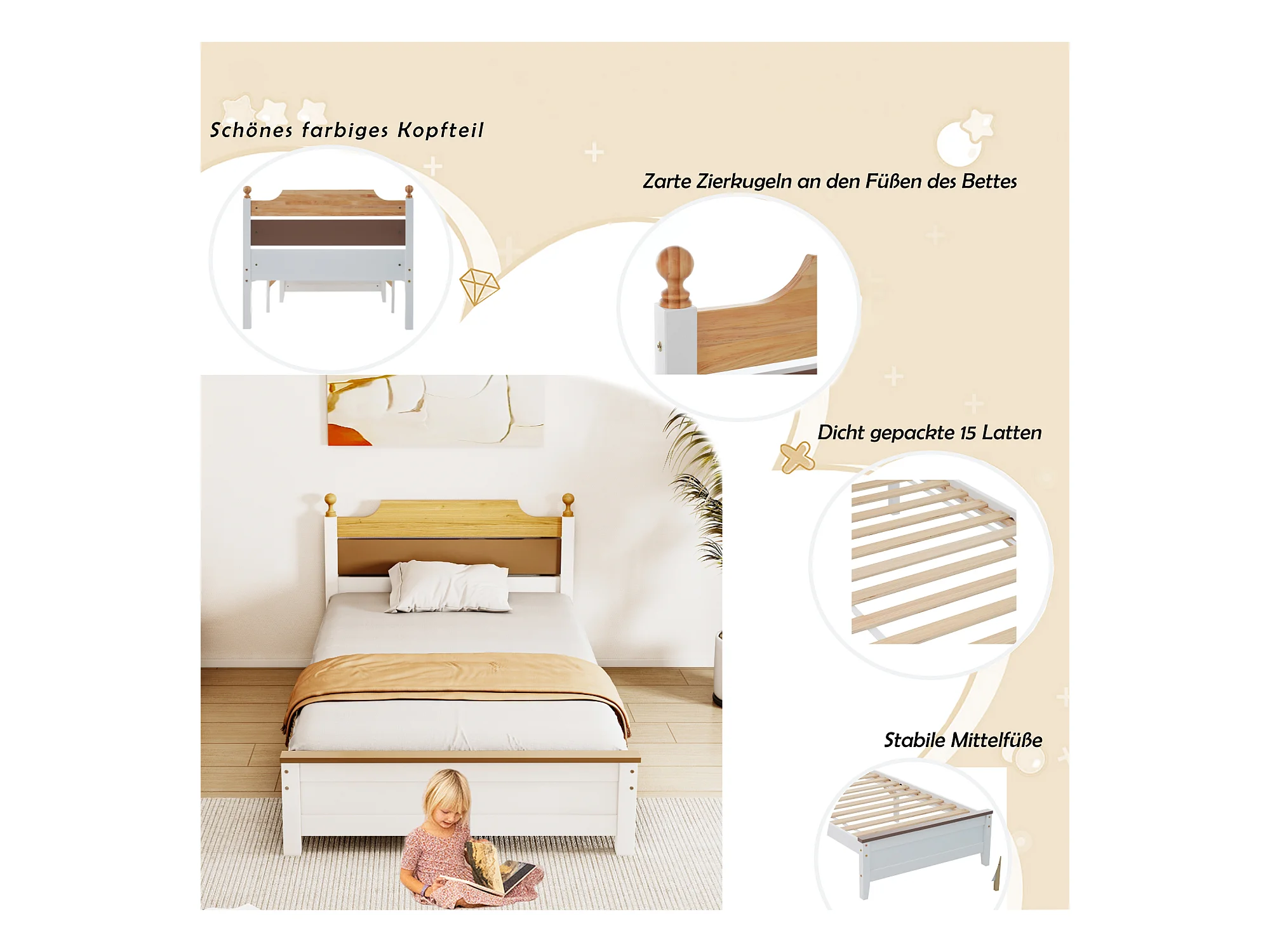 Kinderbed 90 x 200 cm met hoofdbordopberger - massief hout - naturel + wit + matras
