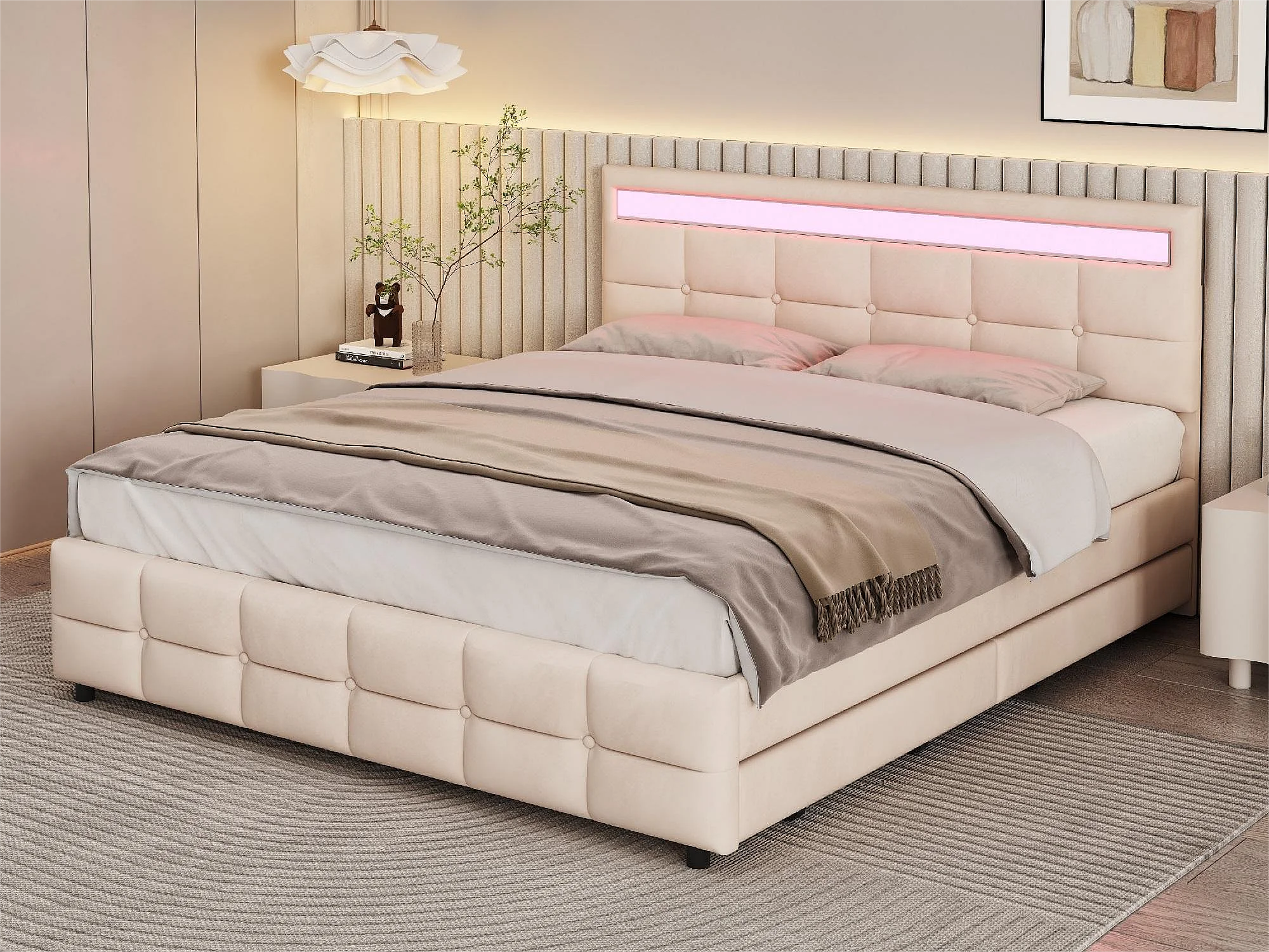 Bed met hoofdeinde en opbergruimte - 180 x 200 cm - 4 lades - fluwelen stof - LED verlichting - lattenbodem - beige