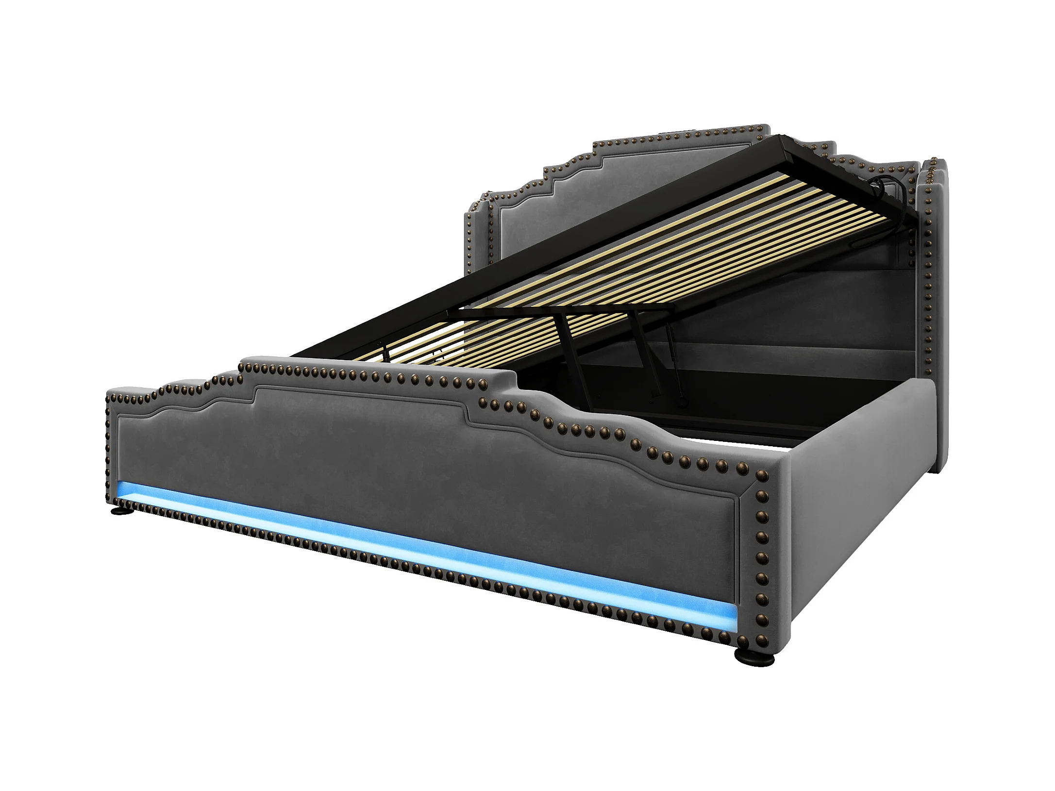 Bed met hydraulische opbergruimte, fluweel, grijs, LED en USB-C (140x200x120 cm)
