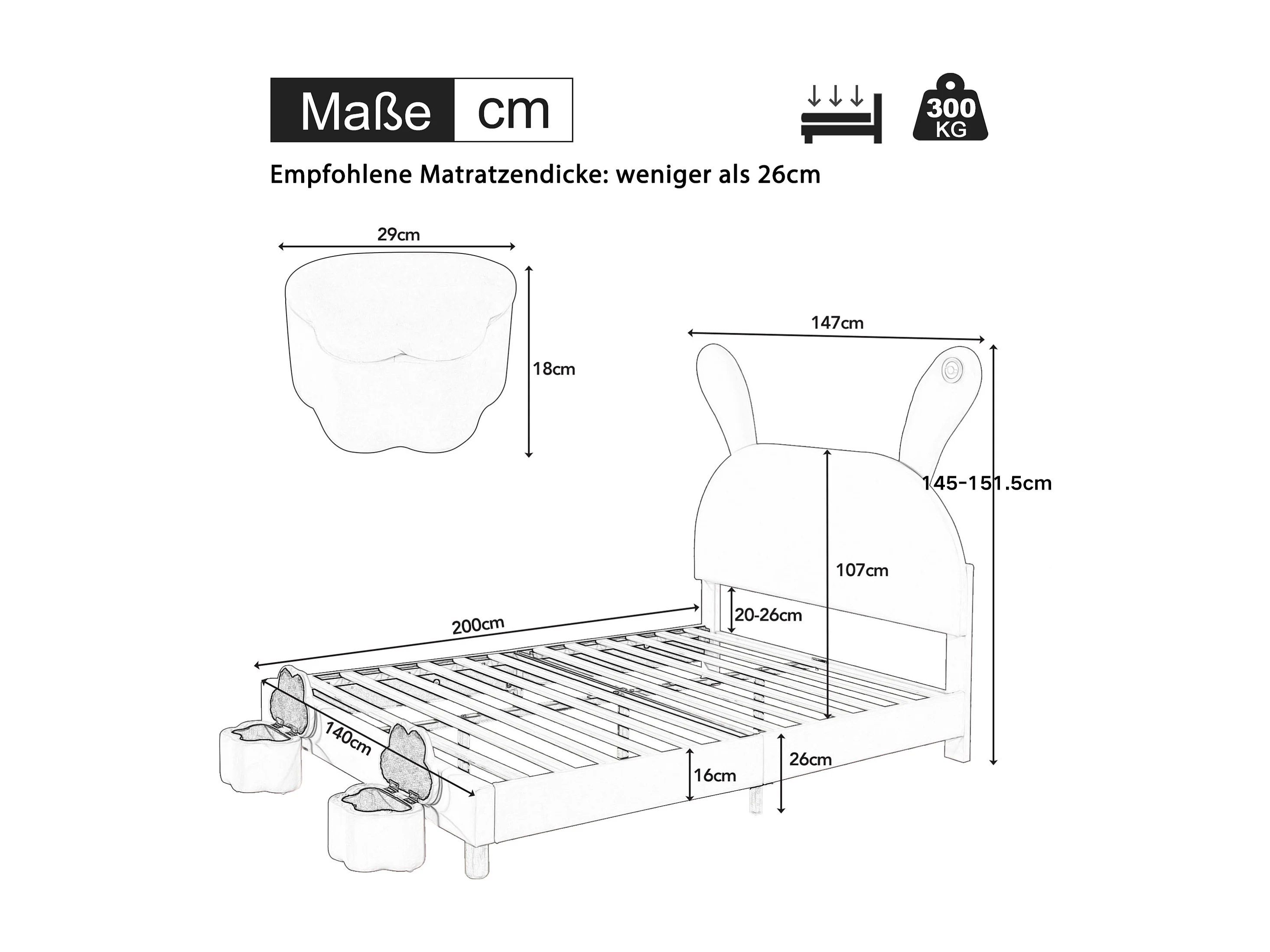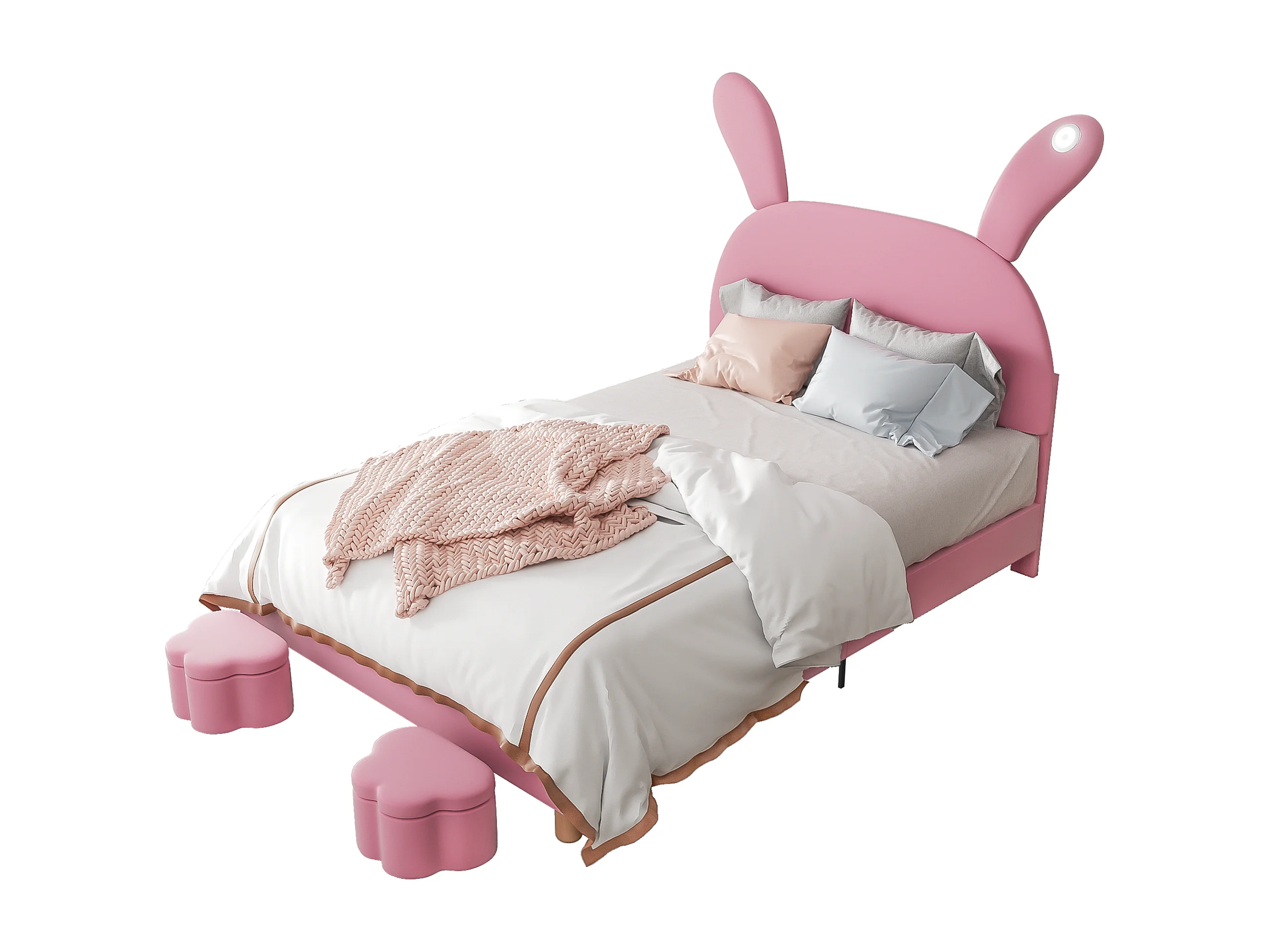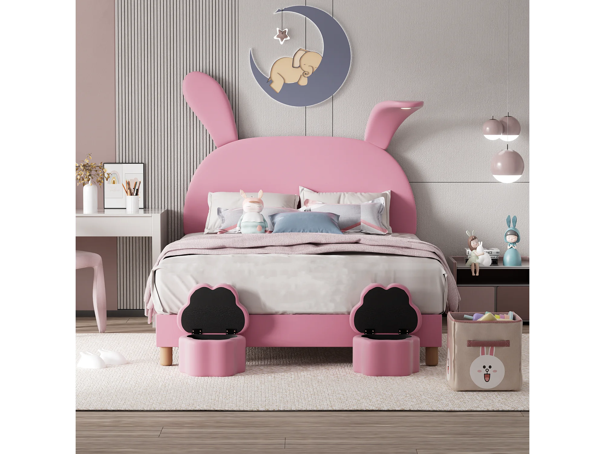 Bed met opbergruimte 140x200, 2 opbergpoefs, LED-verlichting, opvouwbare hoofdkussens, in roze fluweel (140x203,5x145/151,5 cm)