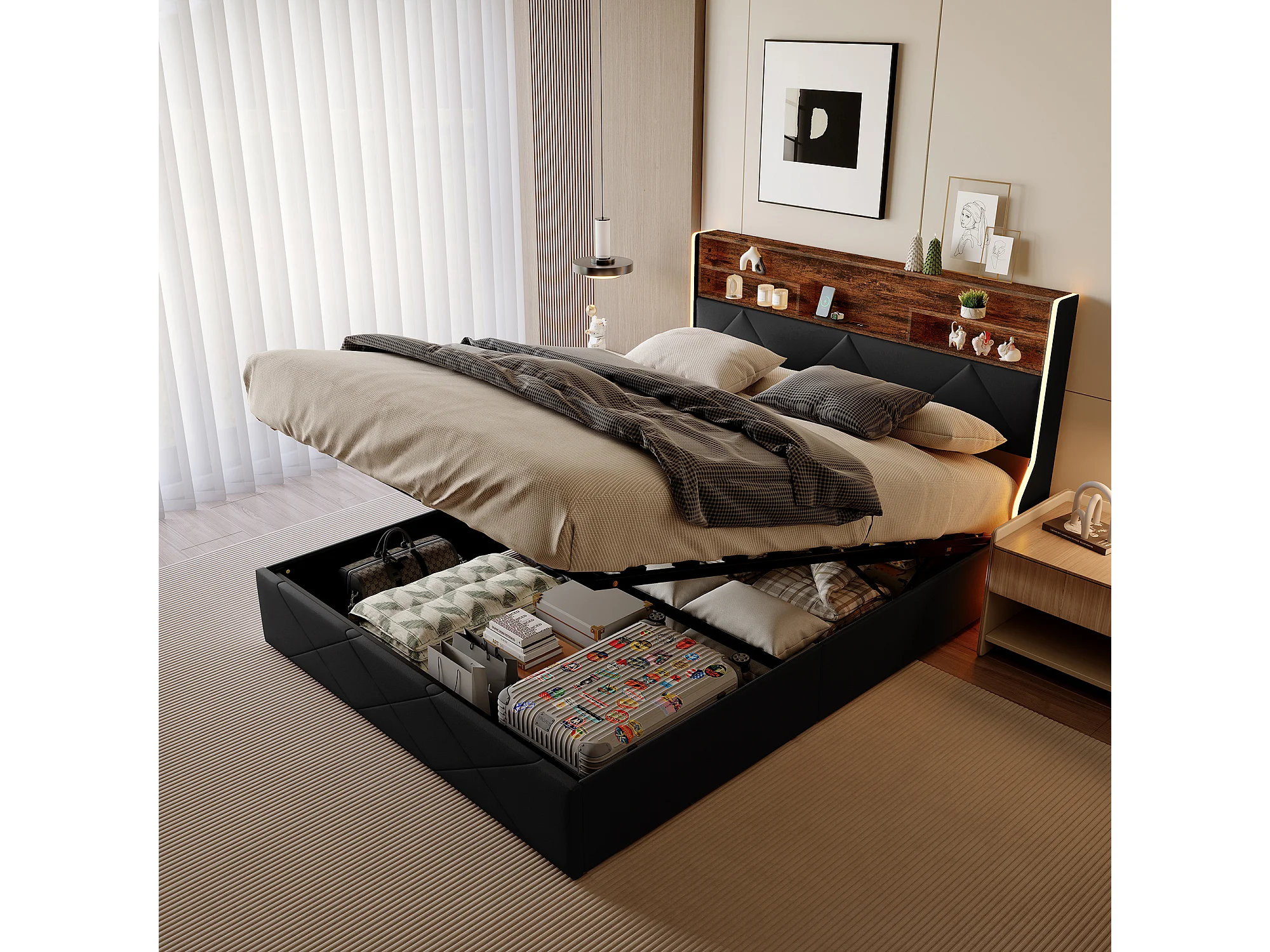 Bed met opbergruimte 140x200 cm in zwart kunstleer en licht eikenhout, hoofdbord met opbergruimte, USB-aansluitingen en LED-strips